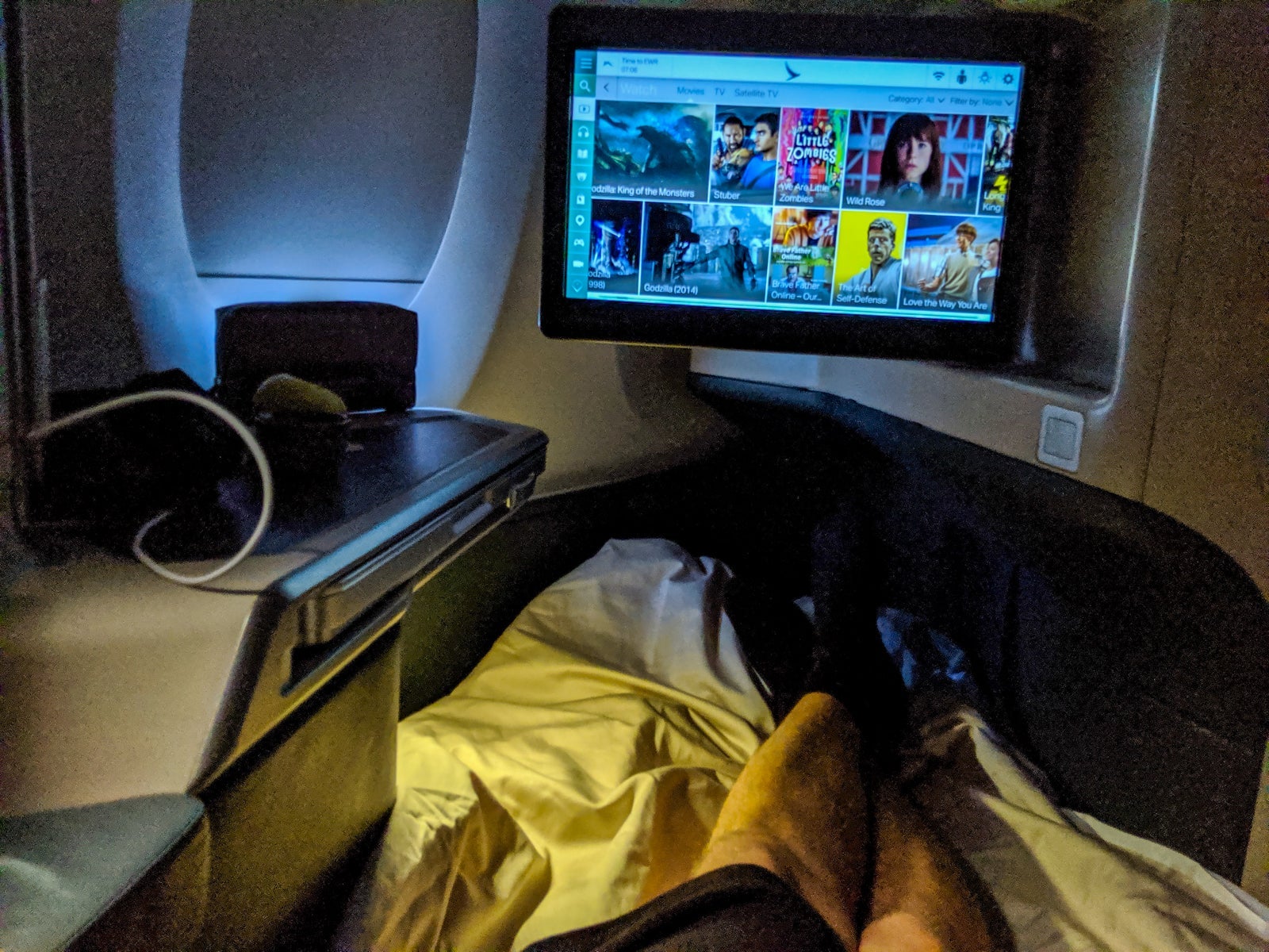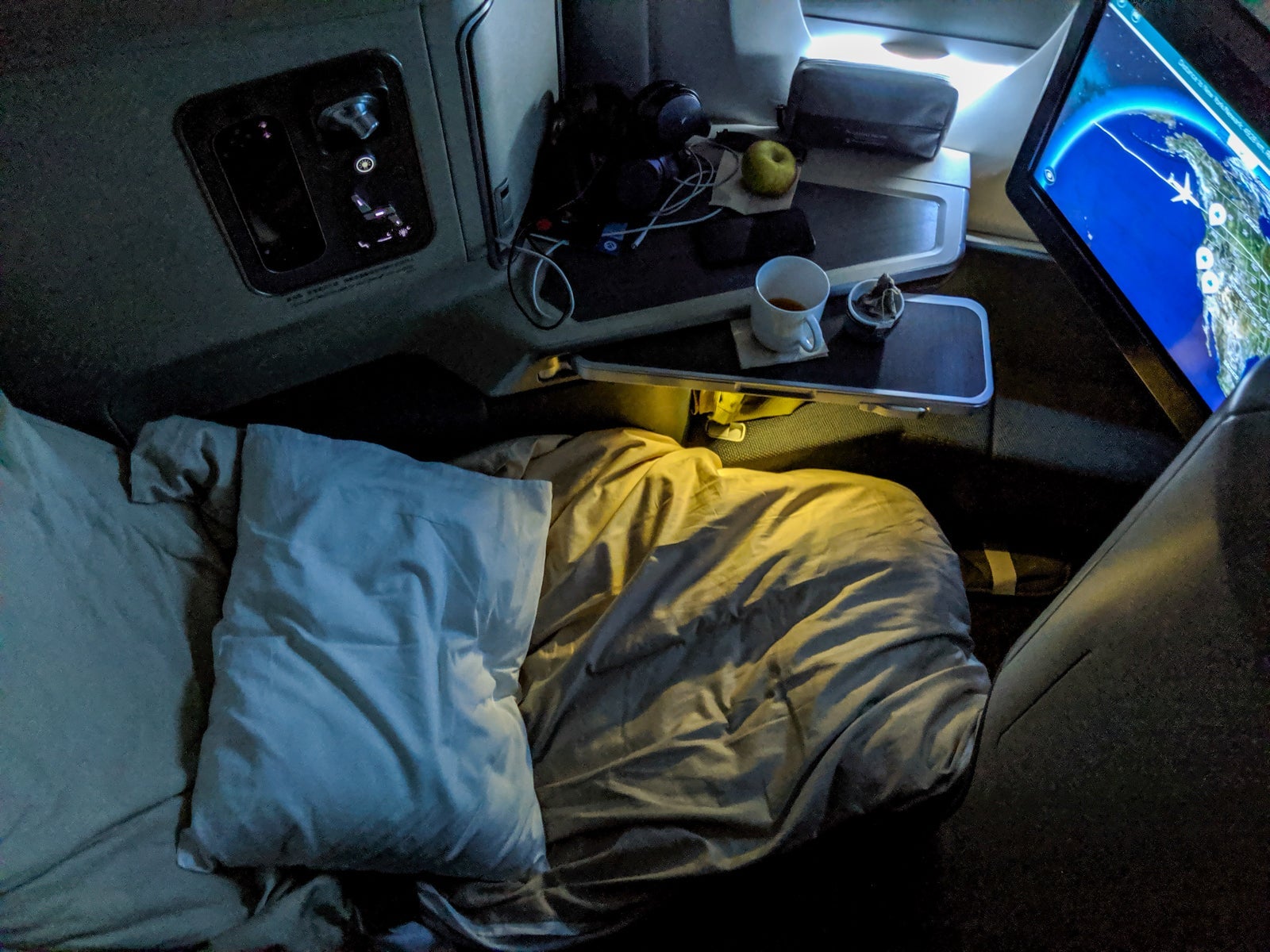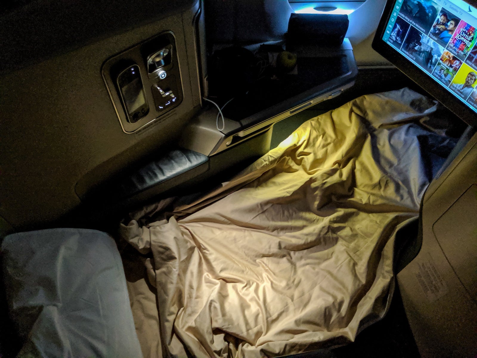 Two, the screen didn't doesn't tilt, making it harder to watch while in full bed mode, but I preferred saving lie-flat for sleeping anyway. Most premium cabin screens don't tilt, either, and I plenty enjoyed watching all flight long.