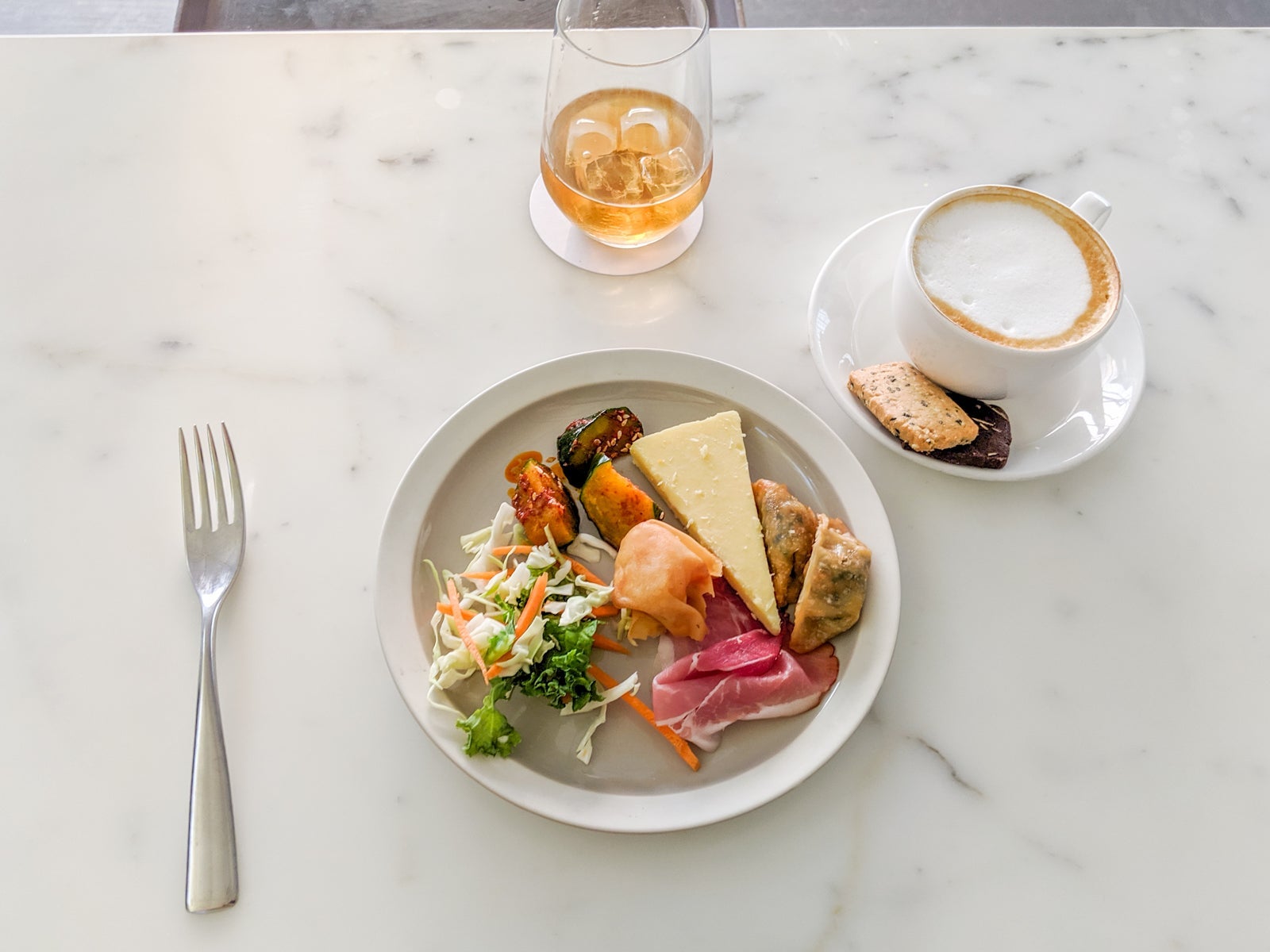 After ordering a bourbon on the rocks, there I sat, cappuccino, noodles and appetizer plate in hand(s), to soak in the stunning airport views with one final Hong Kong sunset. The bartender and all of the lounge staff were courteous and even happy to chat. I found even more snacks, like chips, guacamole, potstickers and a Hong Kong favorite, cucumbers with chili oil, bookending the bar.