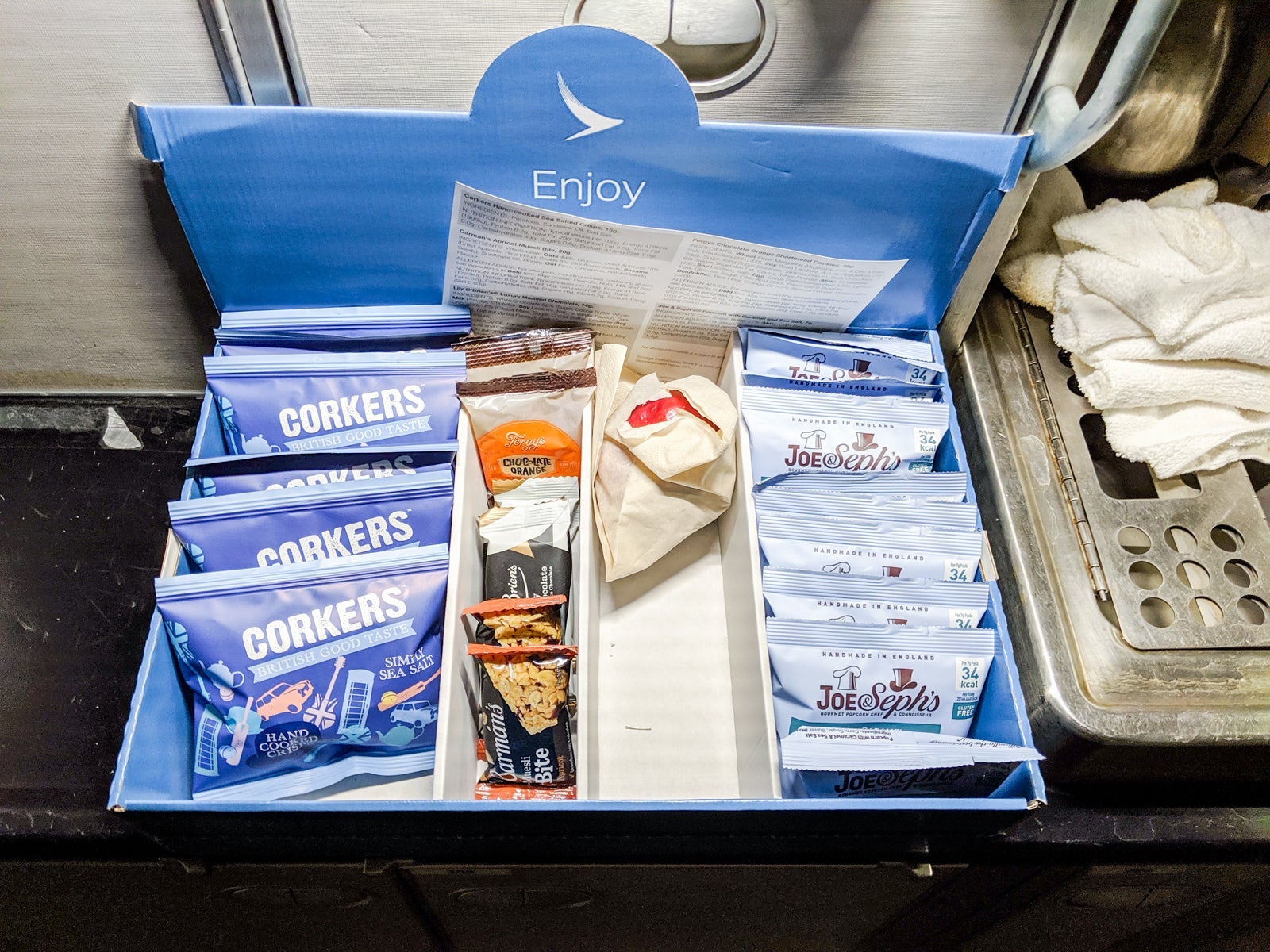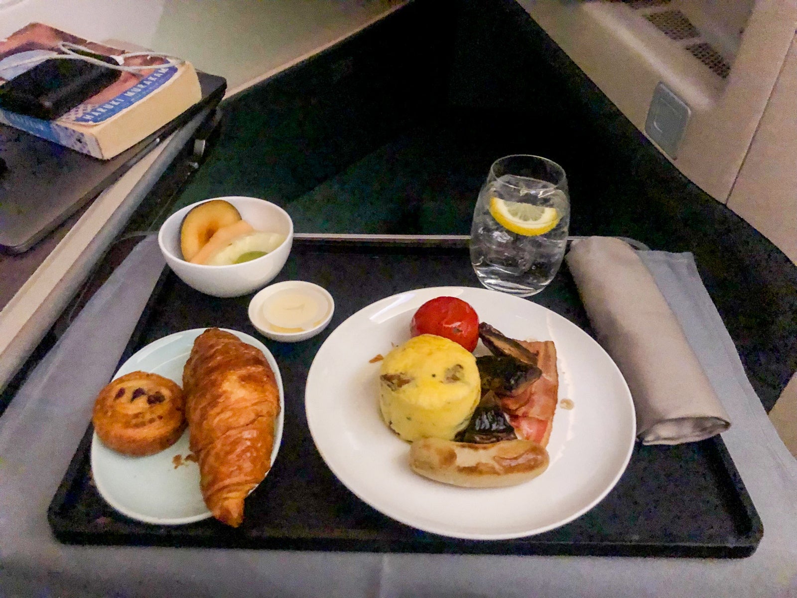 Shortly after, addressing me by name, a flight attendant asked what I wanted for my arrival meal. It was still several hours away, but I understood the cabin crew seizing the opportunity to ask while I was awake. I ordered the Western meal over the congee. As I got up to change clothes, I noticed an inflight snack bar in the galley. Not that premium-looking, but a nice gesture. I grabbed a miniature granola bar.