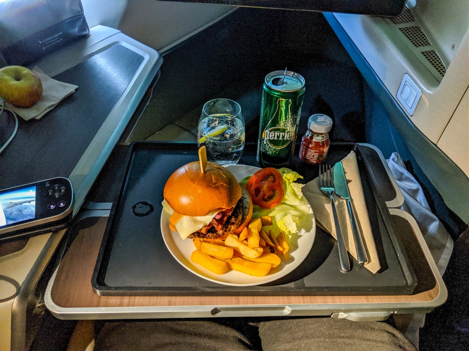 One of the biggest treats of flying business class, especially Cathay biz, is the food available on request. Throughout the flight, passengers can order any of the three snack options, which includes noodle soup, a hamburger and a roasted squash, spinach and orzo salad. For years, I'd heard about the burger, so I hit the call button on the remote to order one. Twenty seconds later, I placed my order; the flight attendant explained it would be about a 20-minute wait. I had nothing but time. "No problem at all," I replied.