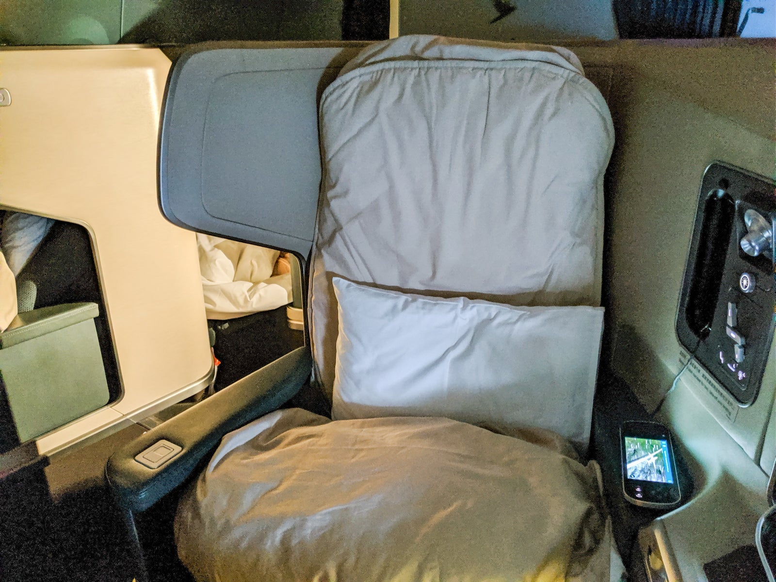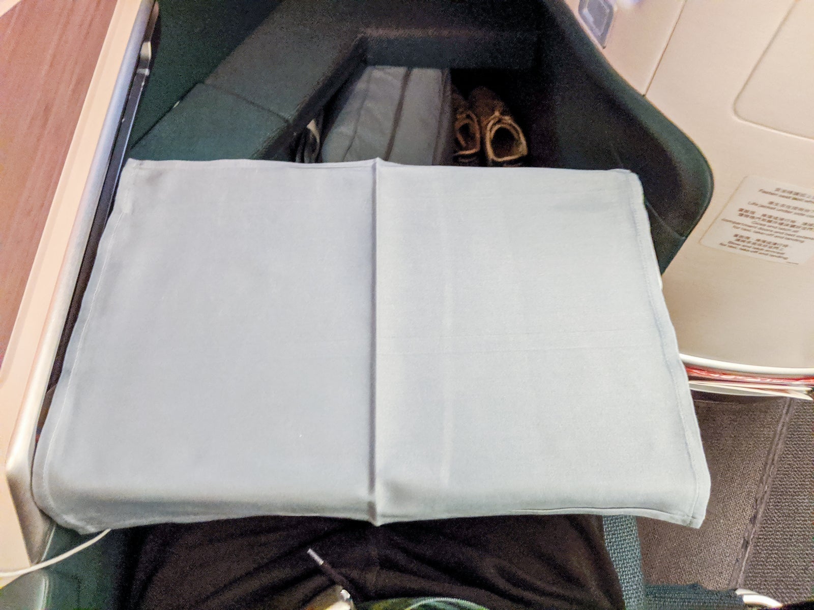 The bed itself didn't disappoint, especially with the amenities Cathay provided. The mattress pad, while not out of this world, was appreciated. Meanwhile, the duvet and pillow were both quite comfortable (though it was no Saks Fifth Avenue bedding that you'd find on United). Meanwhile, the additional leg space made the seat even more comfortable and really made it feel spacious, even compared to other top-notch reverse-herringbone seats. A leather armrest, while not adjustable, provided additional surface storage space while in bed mode.