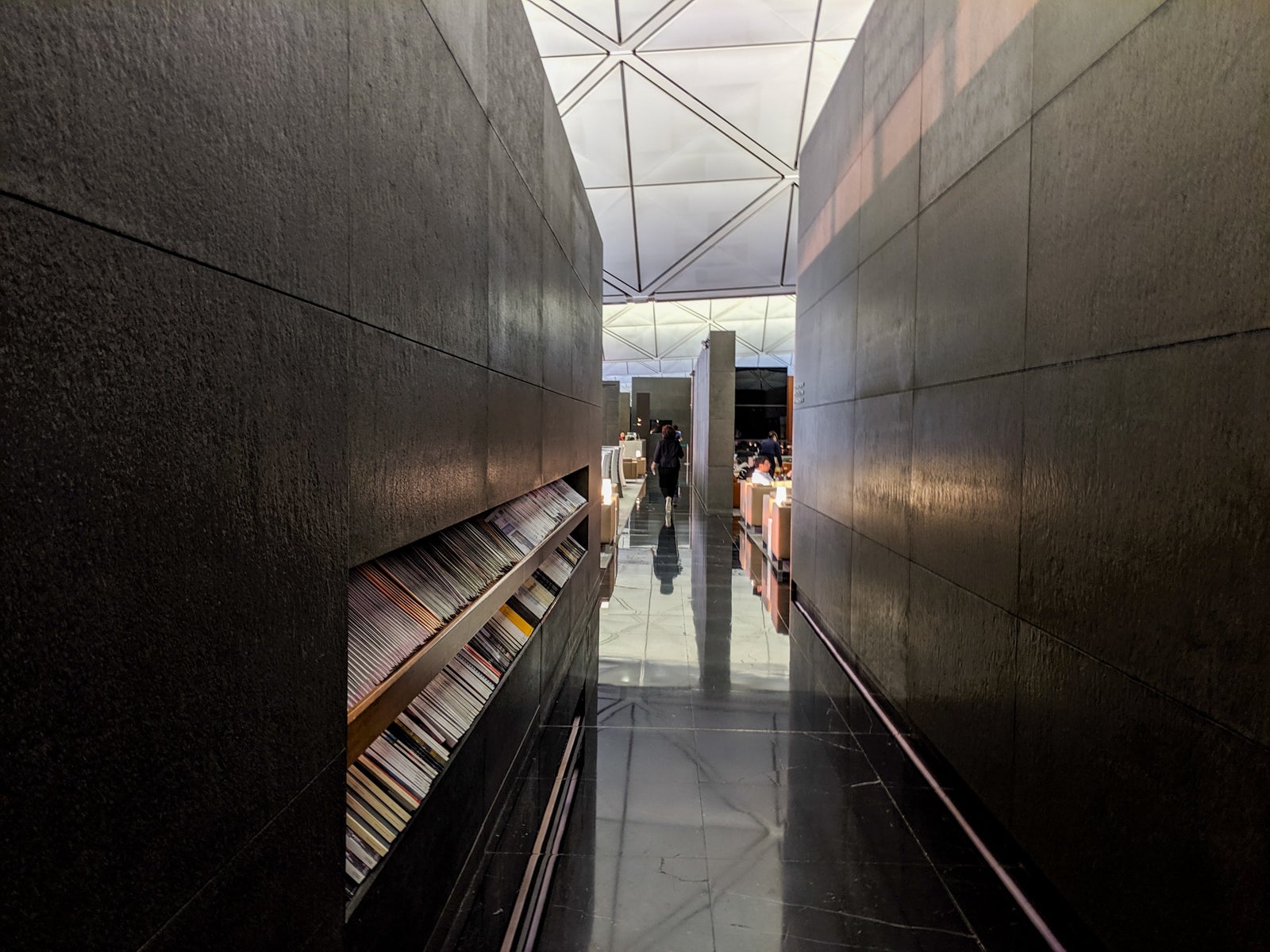 Nestled around the corner, lounge-goers could relax in a coffee bar setting, with pastries and other treats. Like the noodle bar, the baristas received orders but you needed to claim them. I ordered a cappuccino and tried a few cookies and enjoyed each. There were additional magazines in this part of the lounge, as well.