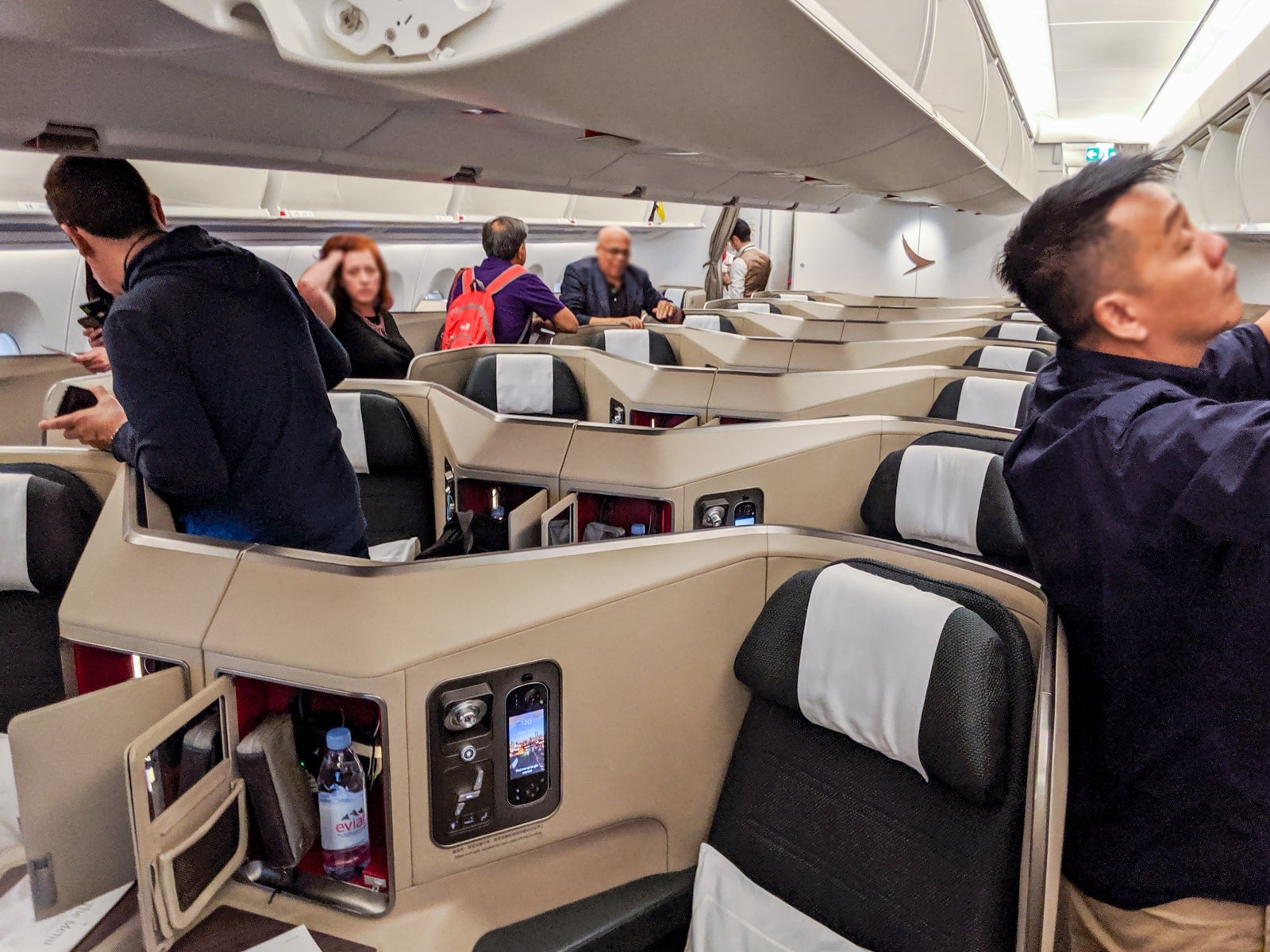 Business class is split into two cabins. While the aft cabin is considered more private, I tried the larger one. As anyone will tell you, Cathay's internationally configured premium cabins are easy on the eyes.