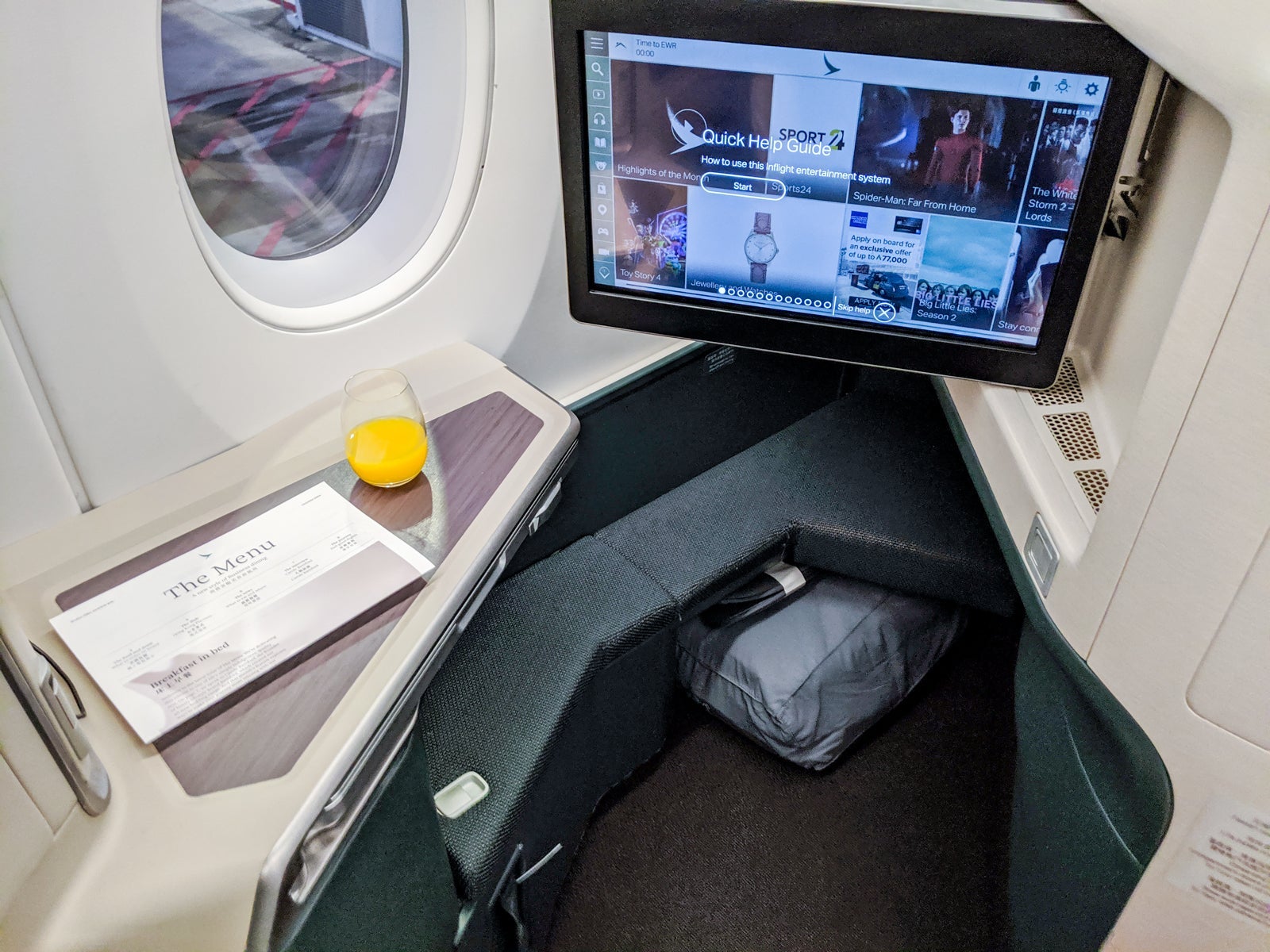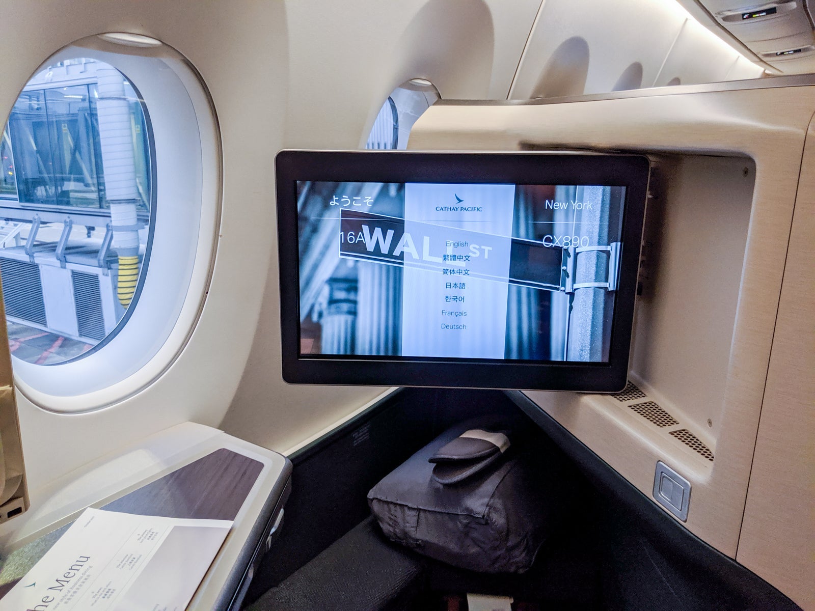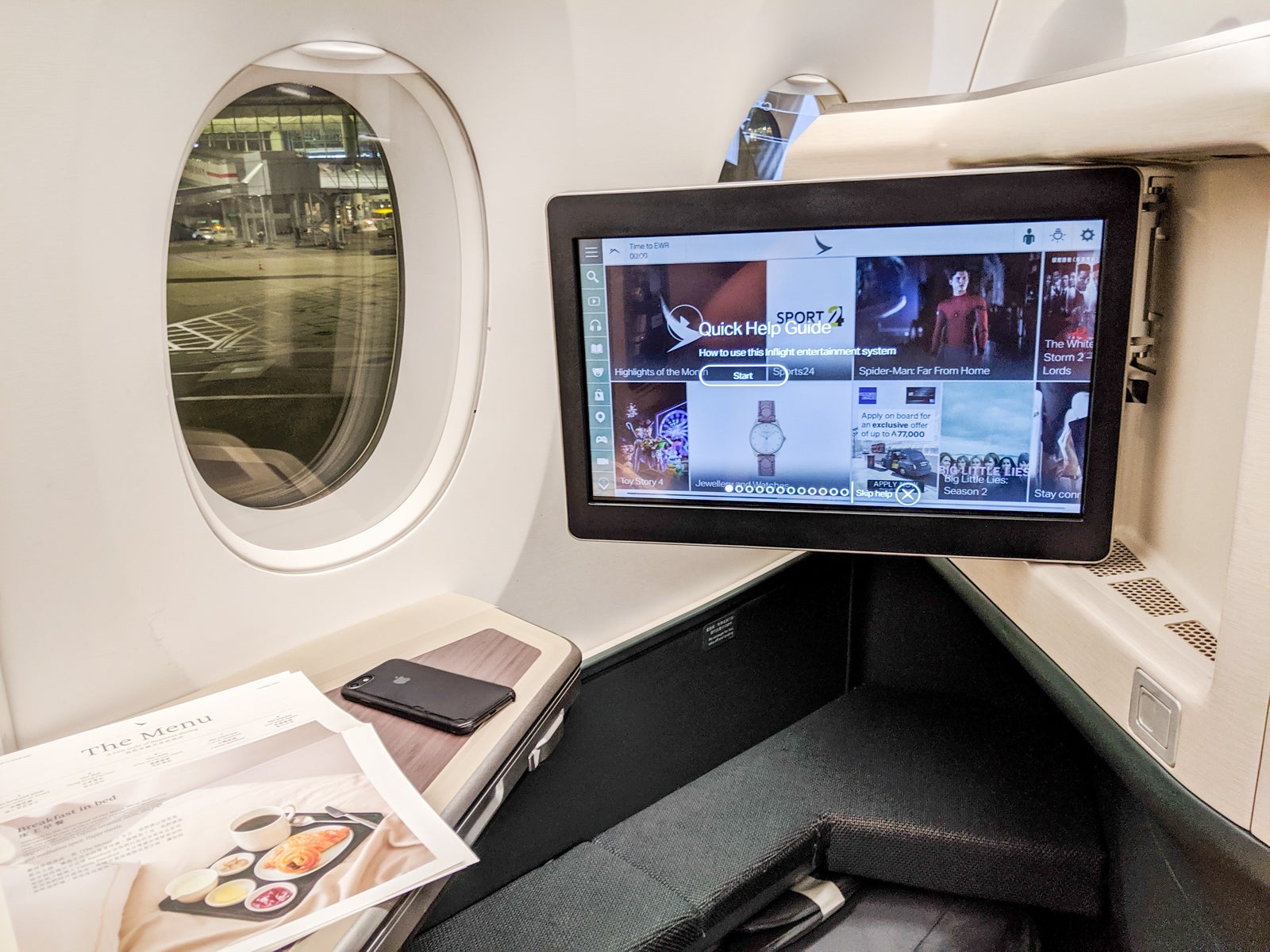 Upon arriving at my seat, I got an overview of the Cathay's business-class amenities.