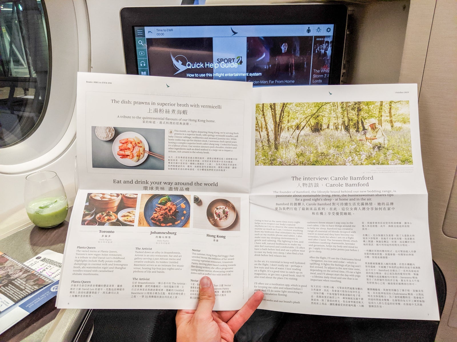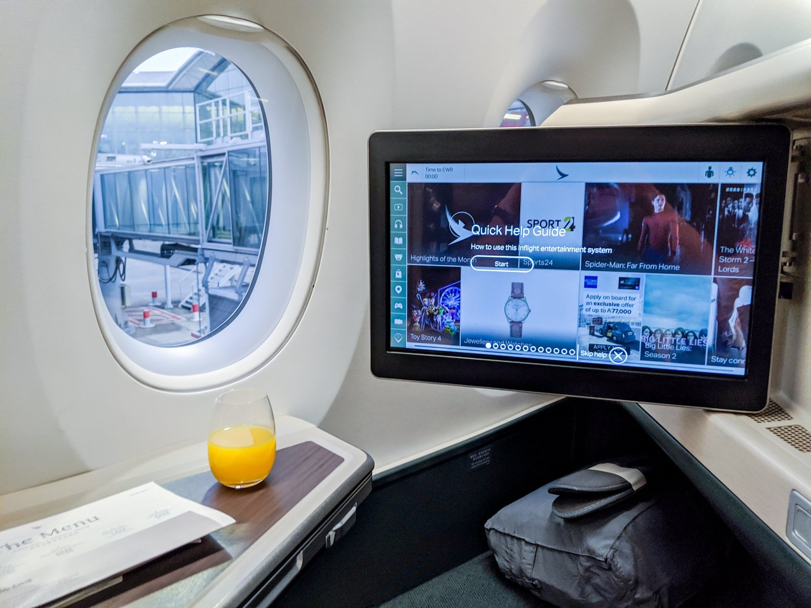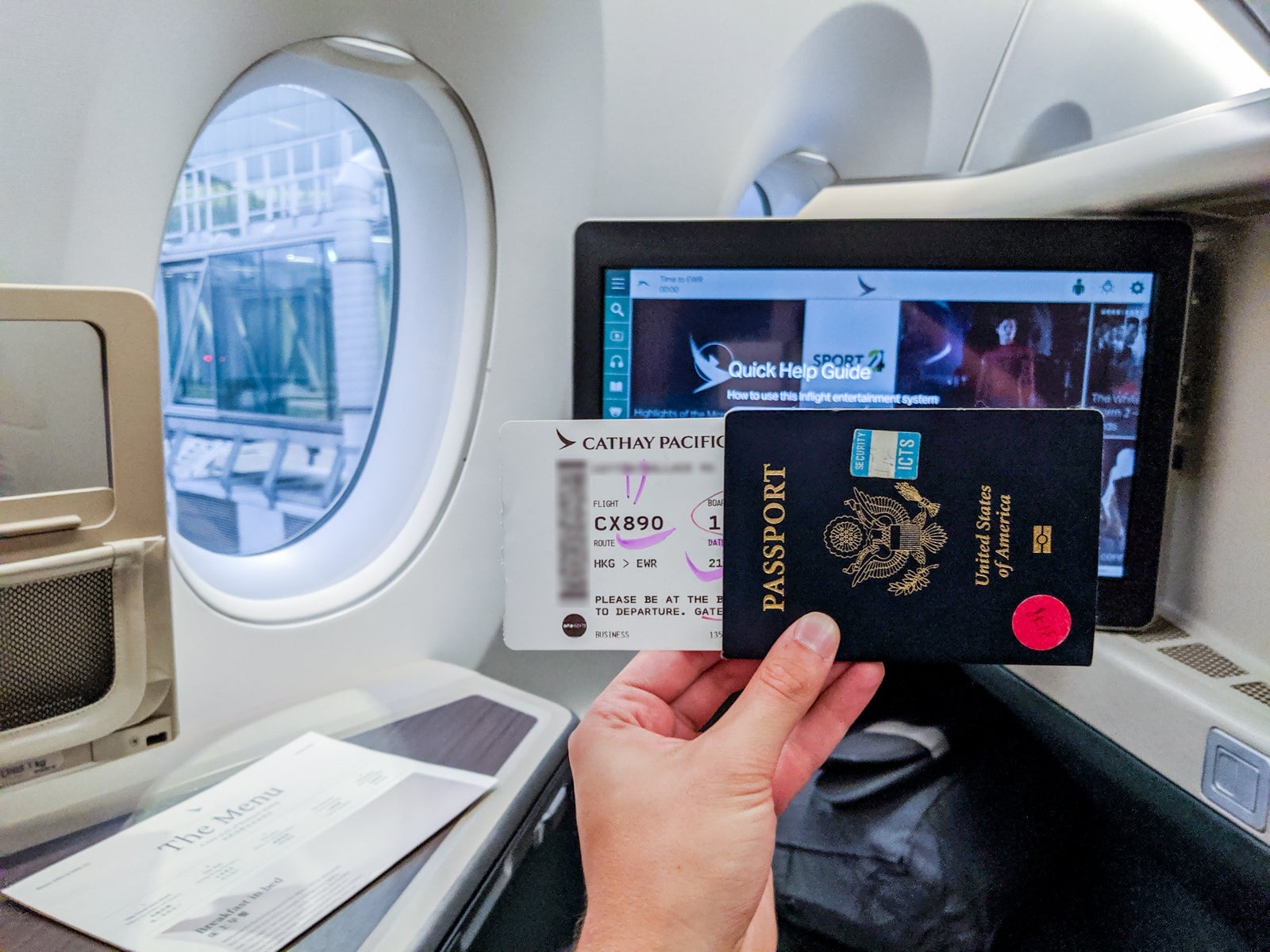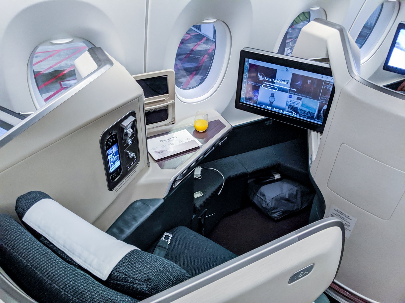Upon arriving at my seat, I got an overview of the Cathay's business-class amenities.