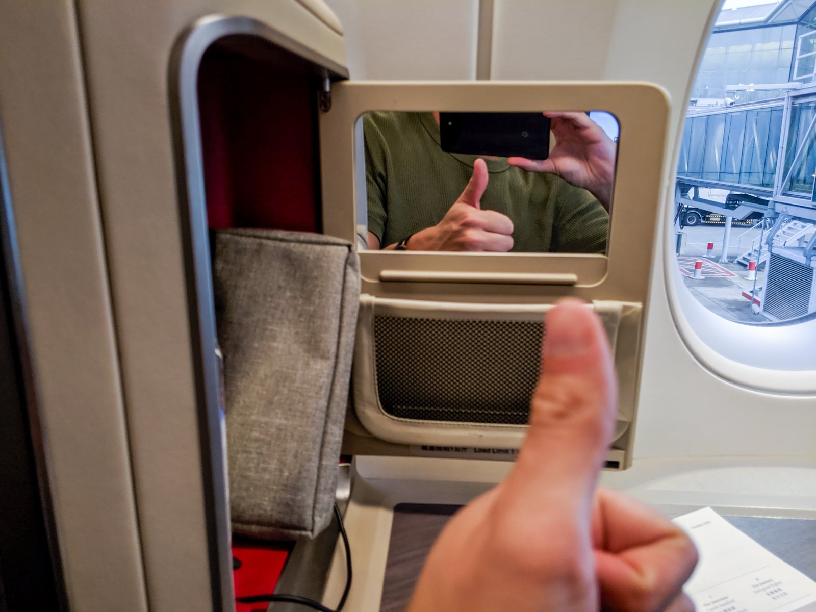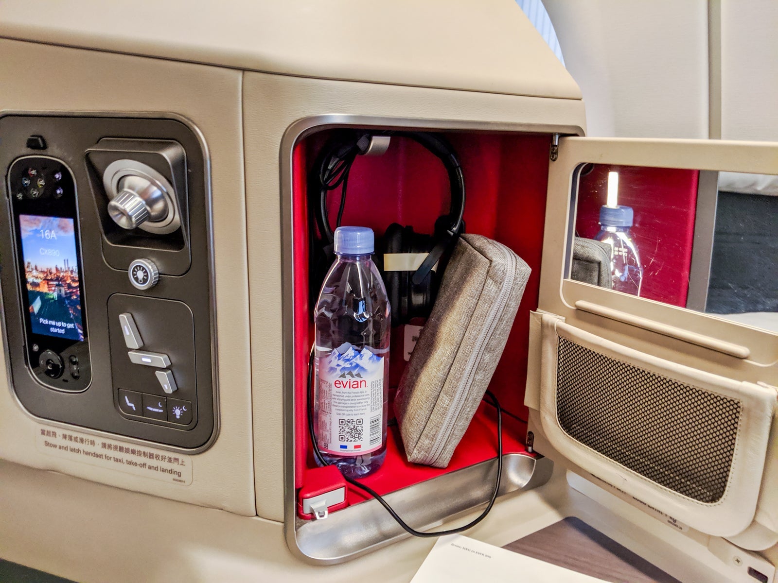 There was a cubby just aft of the table, on the lefthand side of the seat, stocked with Cathay's standard over-ear headphones, an amenity kit, an Evian water bottle, mirror (with a nifty sliding plastic cover) and mesh pocket for small items like phones or chargers. A universal power outlet and standard USB slot were also inside this cubby. Both ports worked consistently throughout the long flight and could be used even with the cubby door closed.