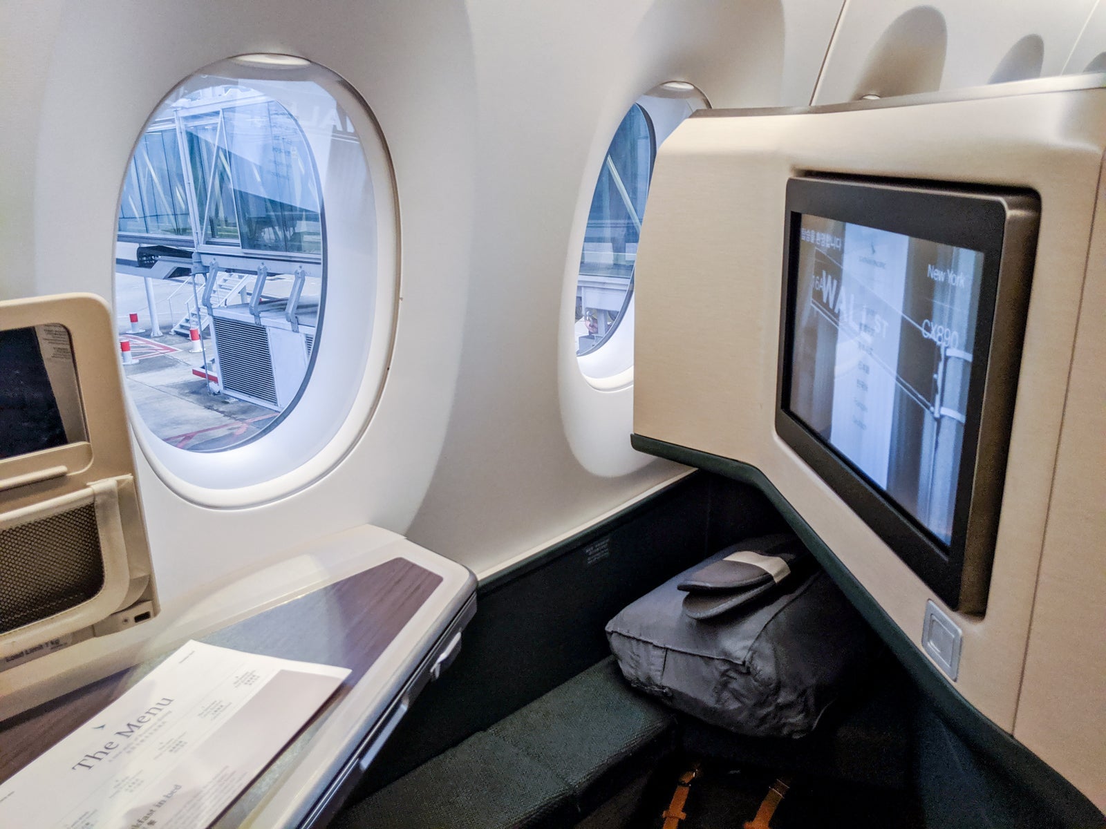 Boarding began right on time. As Cathay's A350s don't offer first class, business-class passengers boarded first. After waiting a few extra minutes for a brief passport check, gate agents scanned my boarding pass, and down the jetway we went!