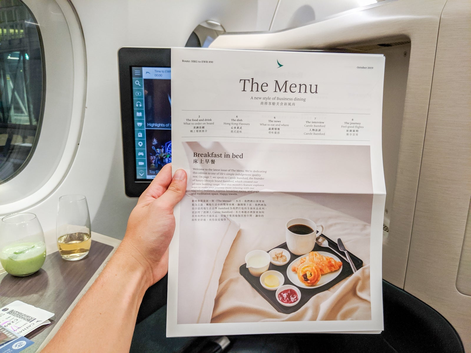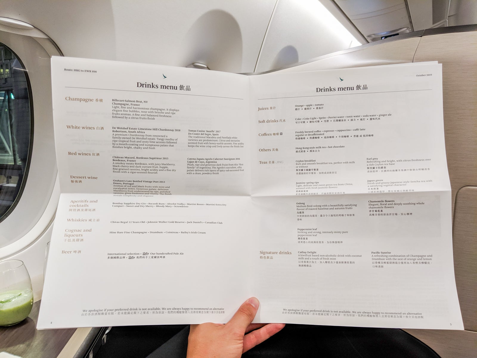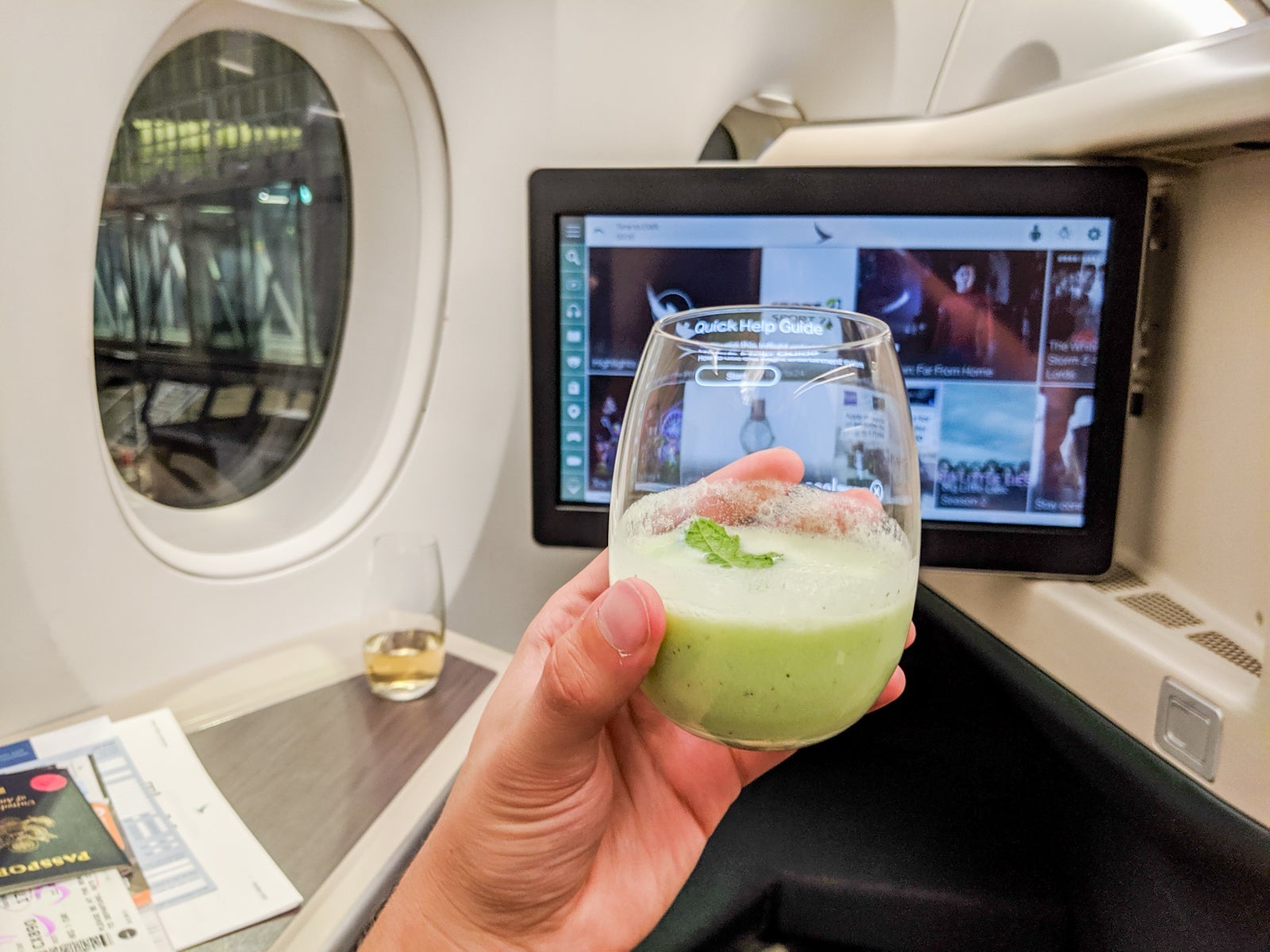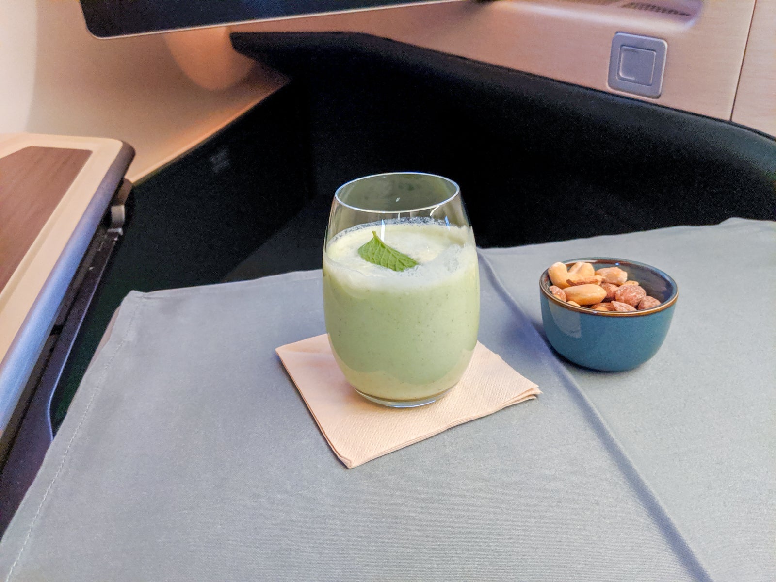 At 6 p.m., some 10 minutes after taking my seat, cabin crew came around offering orange juice, Champagne and Cathay's signature drink, the Cathay Delight, which was a kiwi-based drink with coconut milk and fresh mint and no booze. I asked for all three, and found the Cathay Delight to be refreshing and delicious.
