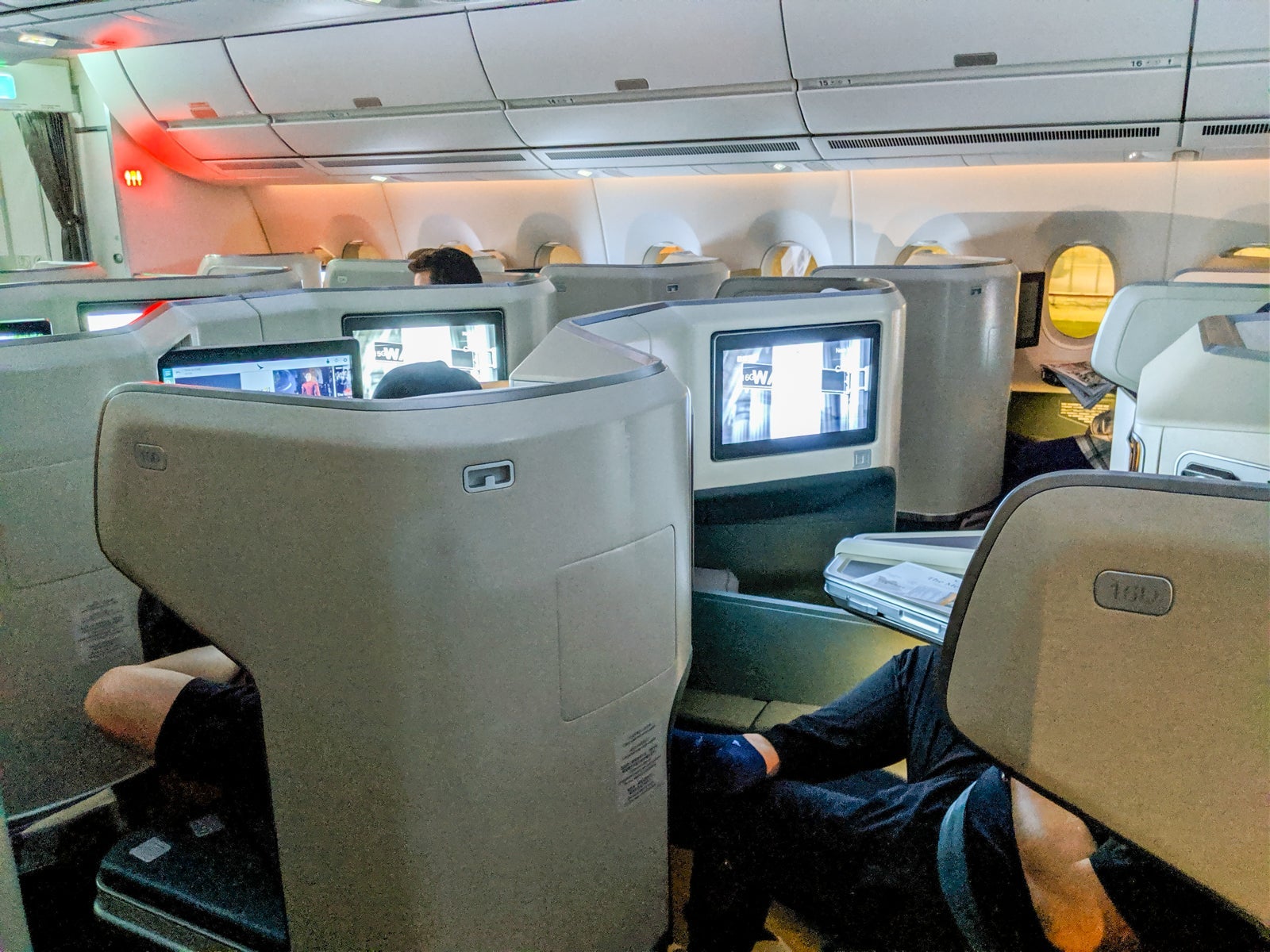 I was in Seat 16A, a window seat and, like nearly all of Cathay's business-class seats, quite private. The best rows for windows are 12 (first row), 14, 17, 18, 19. Row 16's window are slightly obstructed; only one window was fully mine, which made getting a good view out the window somewhat tricky.