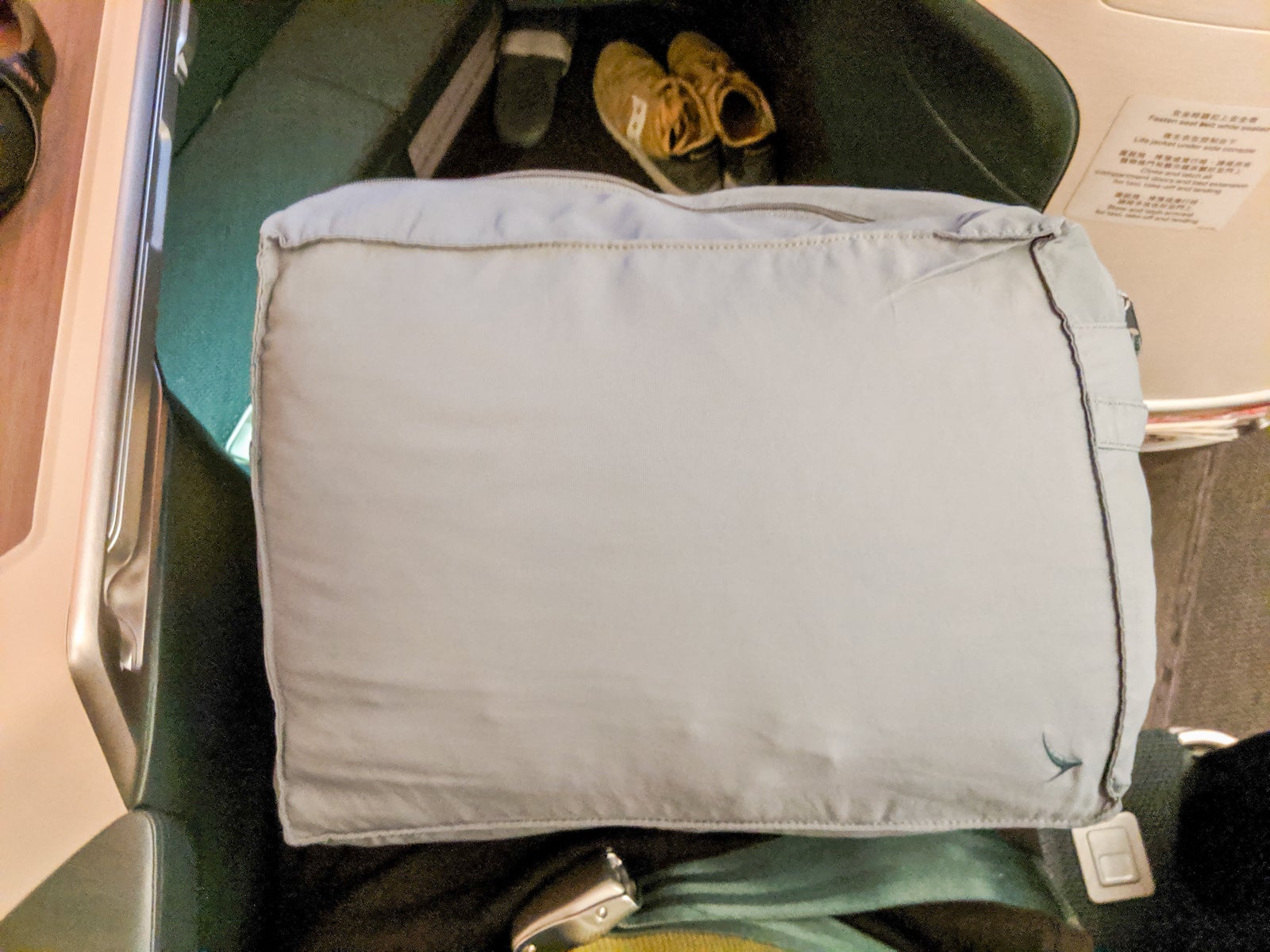 A duvet and pillow were waiting for me near the footrest, along with a mattress pad and complimentary slippers, two items Cathay added to business class in October. The items came in a zippered gray bag. No pajamas were offered in Cathay business class. Once more, I'd recommend bringing a readily accessible change of clothes for sleeping.
