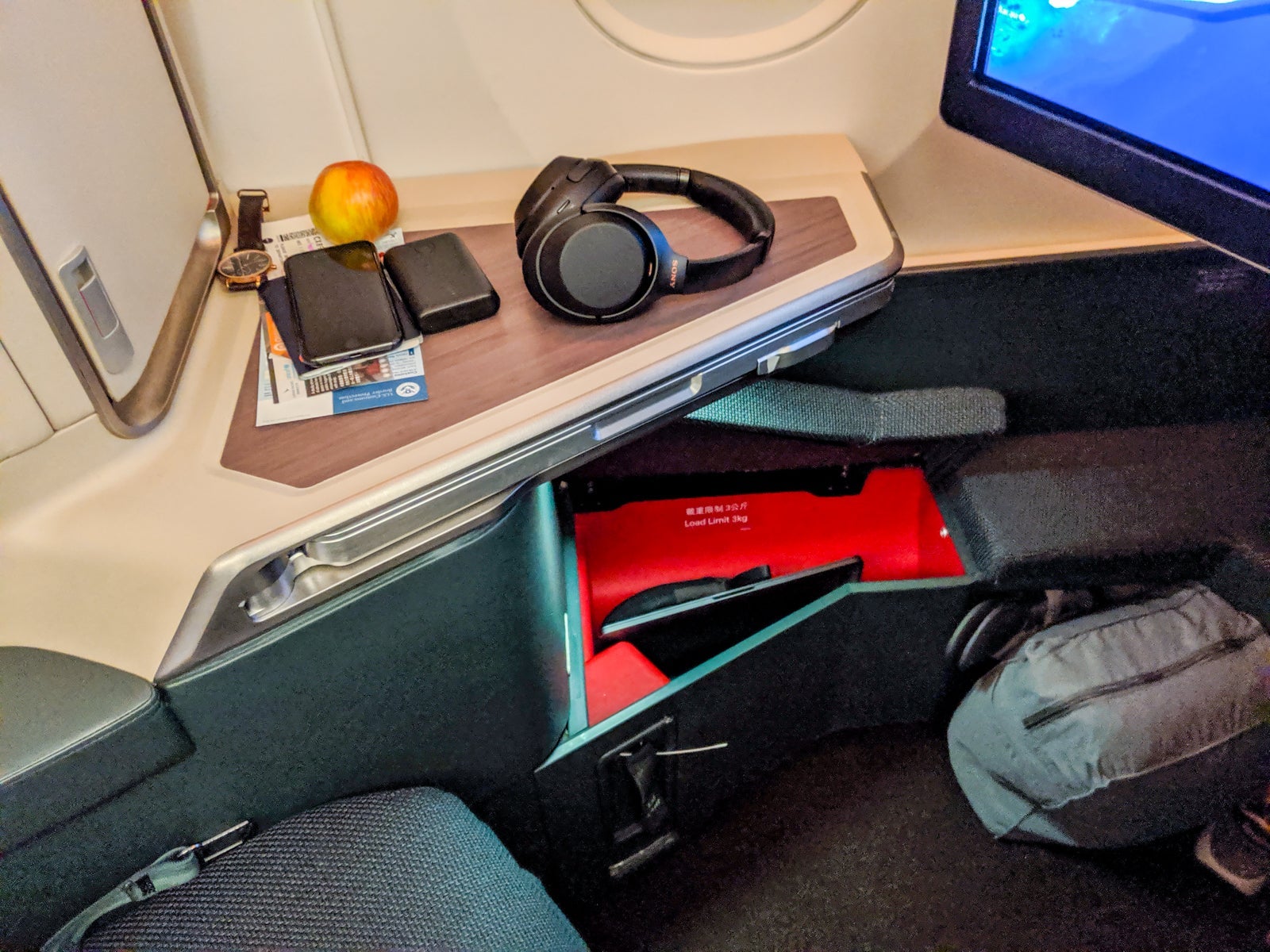 The window side of the seat featured a faux-wood side table. It was smaller than some competitors, but the compartment under my legs made up for it and proved particularly helpful to store the bulkier stuff that usually doesn't fit anywhere, like a 13-inch MacBook, a headphone case, clothes, etc. Plus, with so few people per overhead bin and a 1-2-1 configuration, accessing the large overhead bin for other items was easy. Shoes could be stored under the footrest, as well, providing even more storage space.