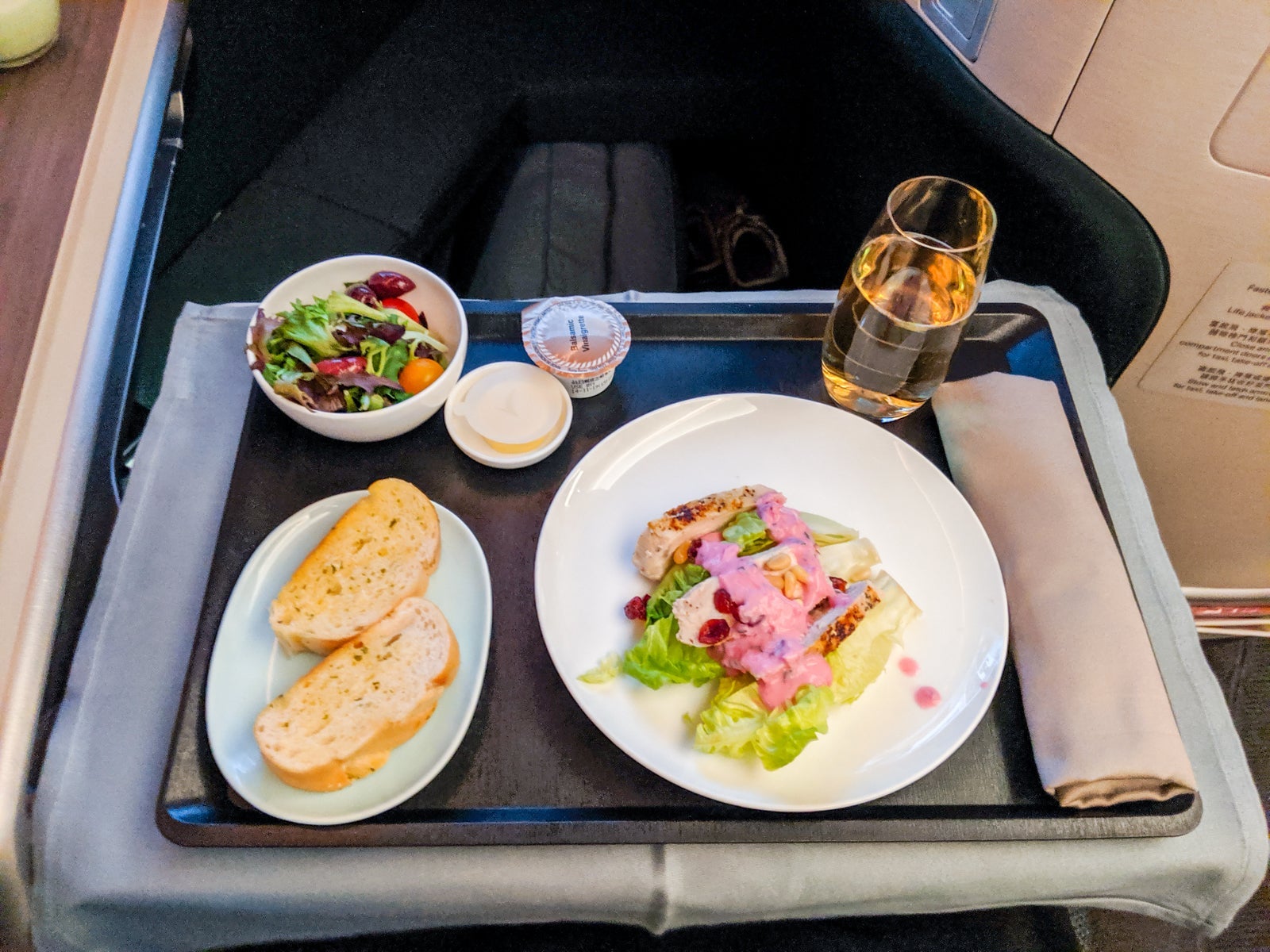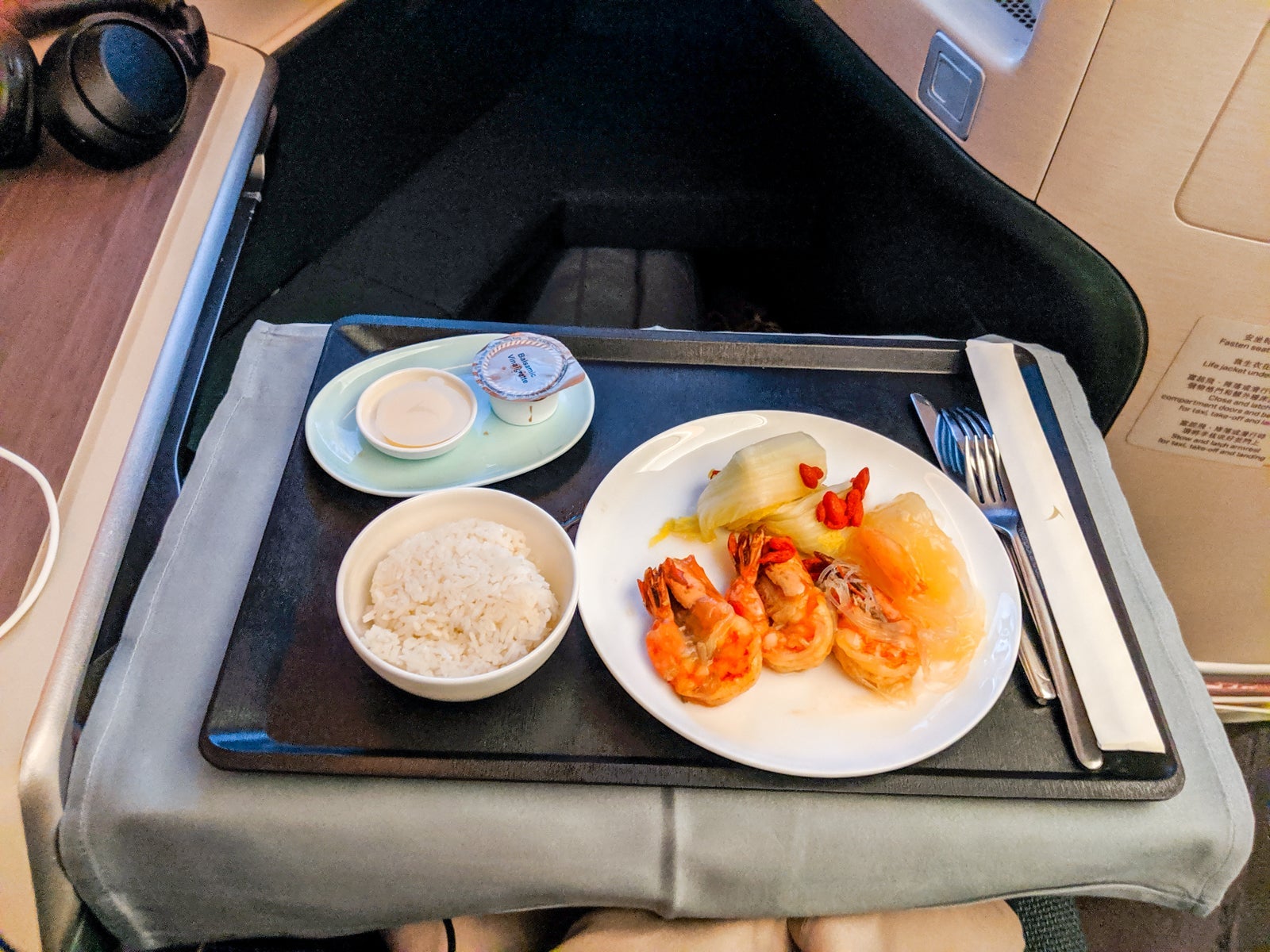 A little too cold and needing salt, this dish was kind of bland. Still, it was above average for business-class meals. Next up, the prawns.