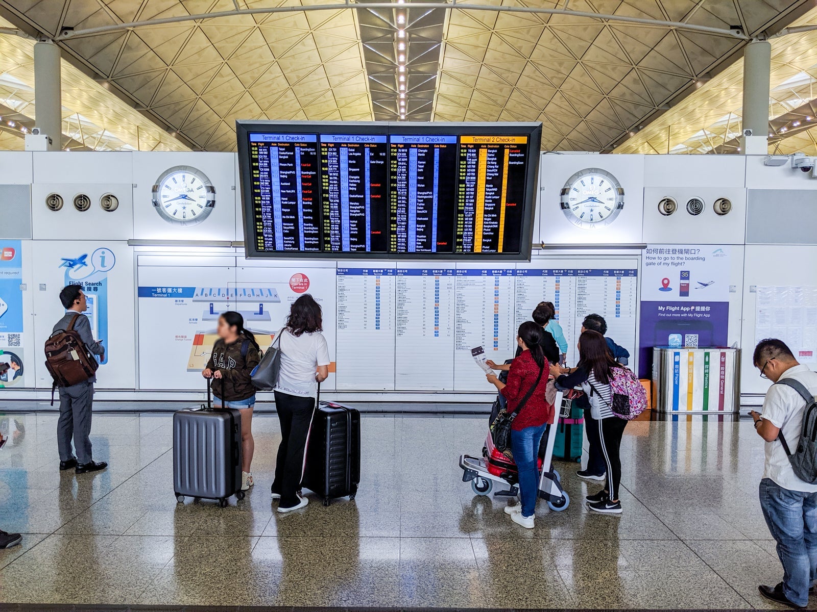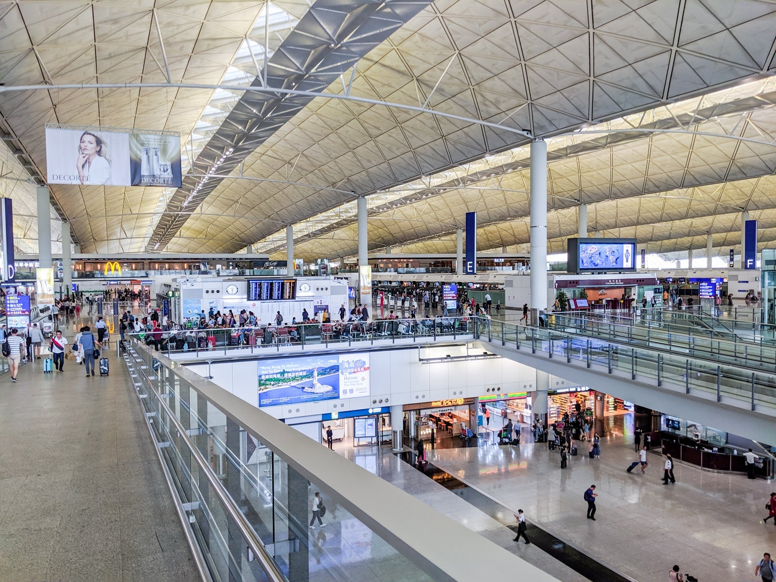 Hong Kong's check-in areas are organized by letters (A through H) that are prominently displayed for easy reference.