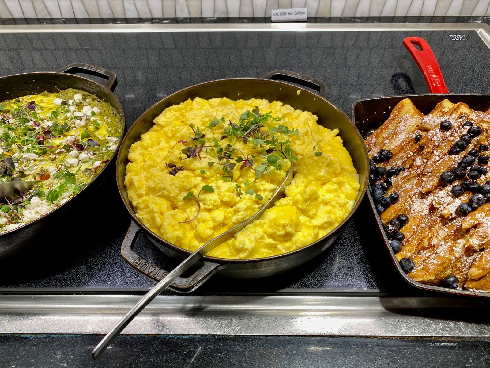 The lounge served a continental breakfast from 5:30 a.m.-6:30 a.m. At 6:30 a.m., a few more hot dishes were brought out, ranging from scrambled eggs to French toast.