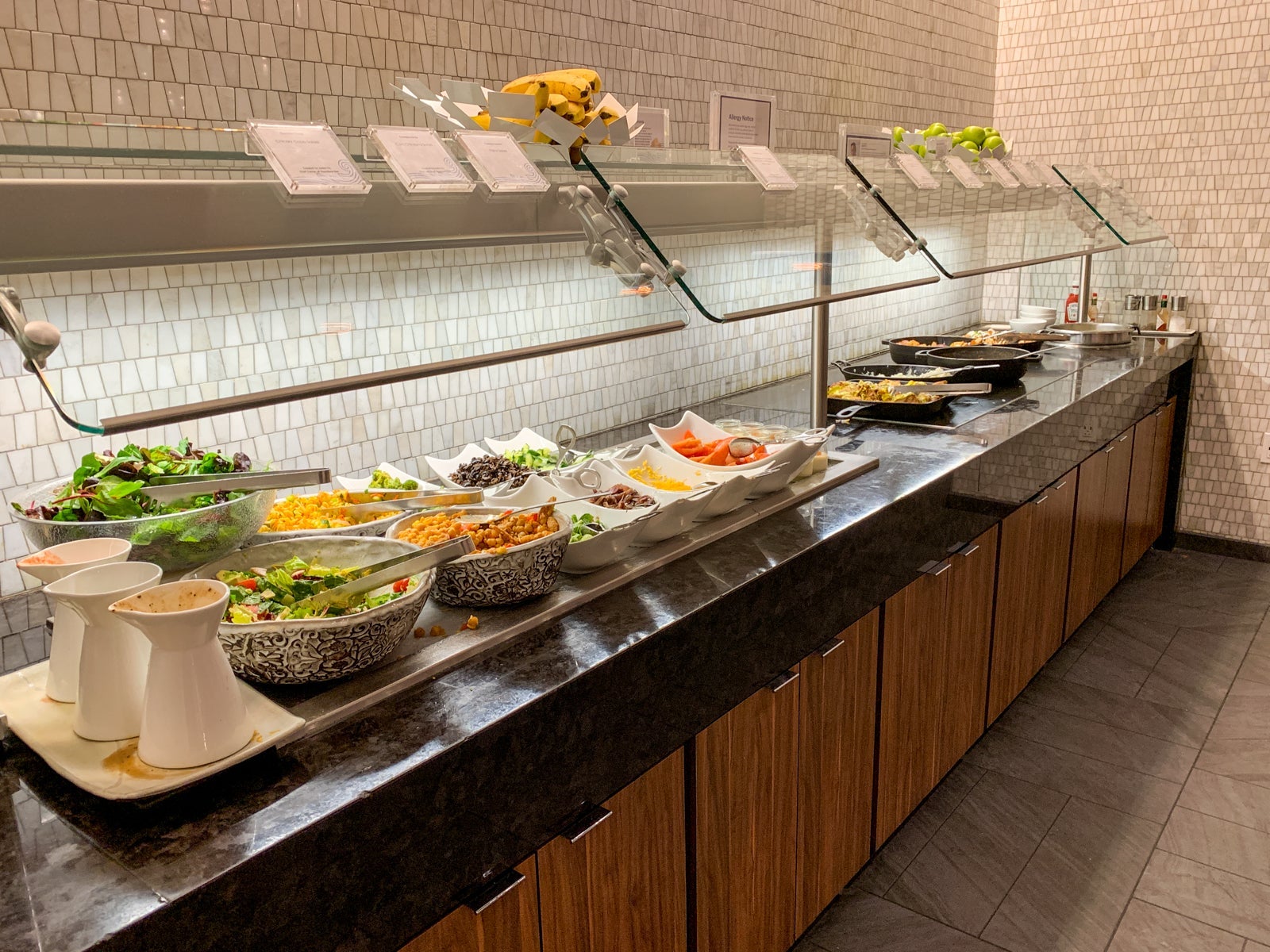 Here you'll find a full hot and cold buffet that rotates from breakfast, to lunch, to dinner. The food menu was designed by Chef Justin Yu, owner and chef at the Houston restaurant, Theodore Rex.