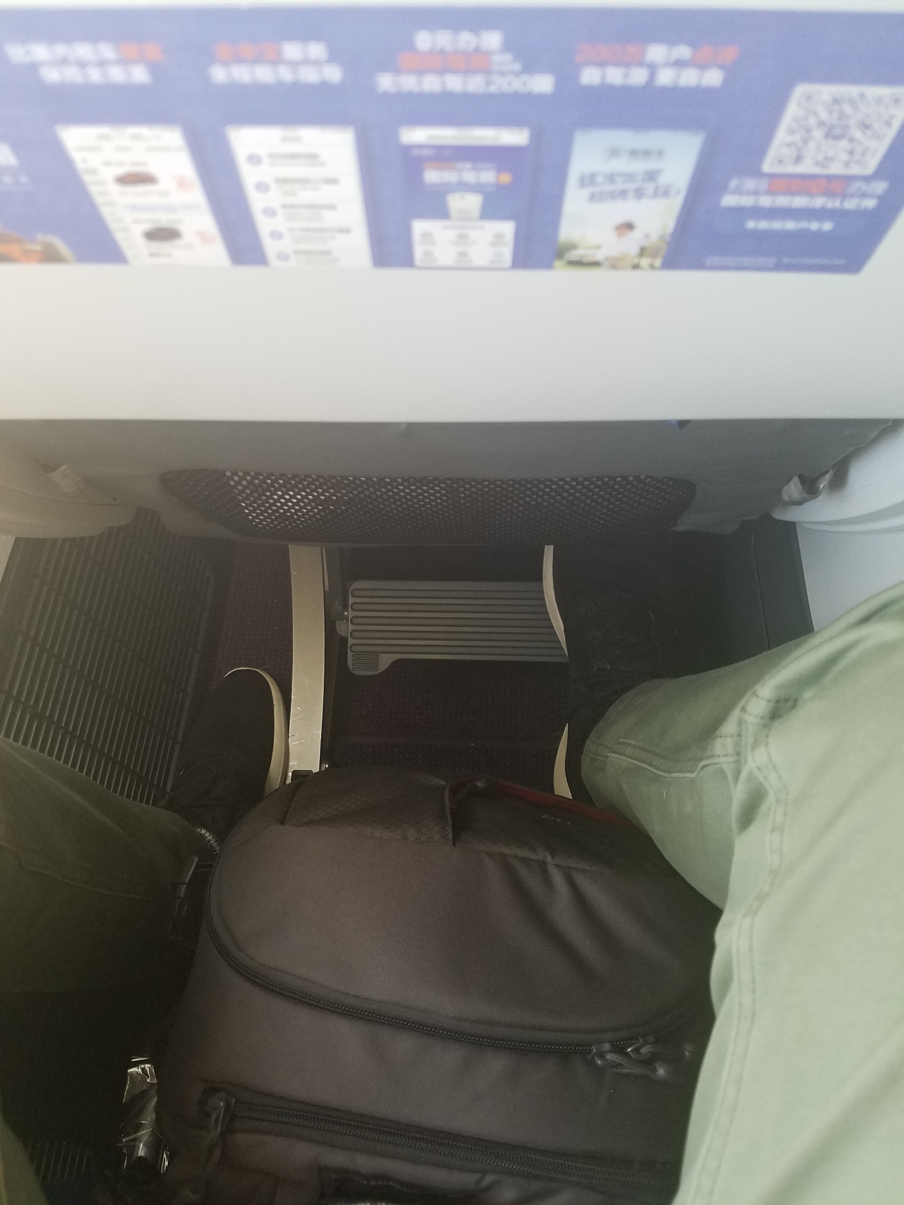 When reclined — China Southern says the angle goes to 123 degrees — I could extend my legs under the seat shell in front. Not quite a lie-flat biz class, but hey, I'd paid $700. An extendable legrest, retractable footrest under the seat in front and a lot more storage space than in economy made this seat a vast improvement over coach.