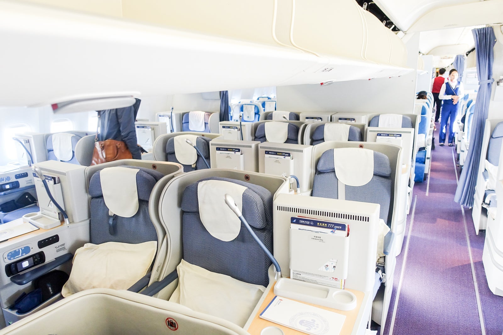 The airbag-style seat belt was unpleasantly heavy and bulky. A small problem, compared to what my fellow passengers in coach were faced with: 32 inches of average legroom throughout the cabin. Kudos to China Southern, however, for resisting the terrible trend among 777 operators to pack economy seats 10 abreast in a 3-4-3 layout, and keeping the 3-3-3 arrangement that the airplane was originally designed for. The result was a coach cabin that did not provoke despair on sight.