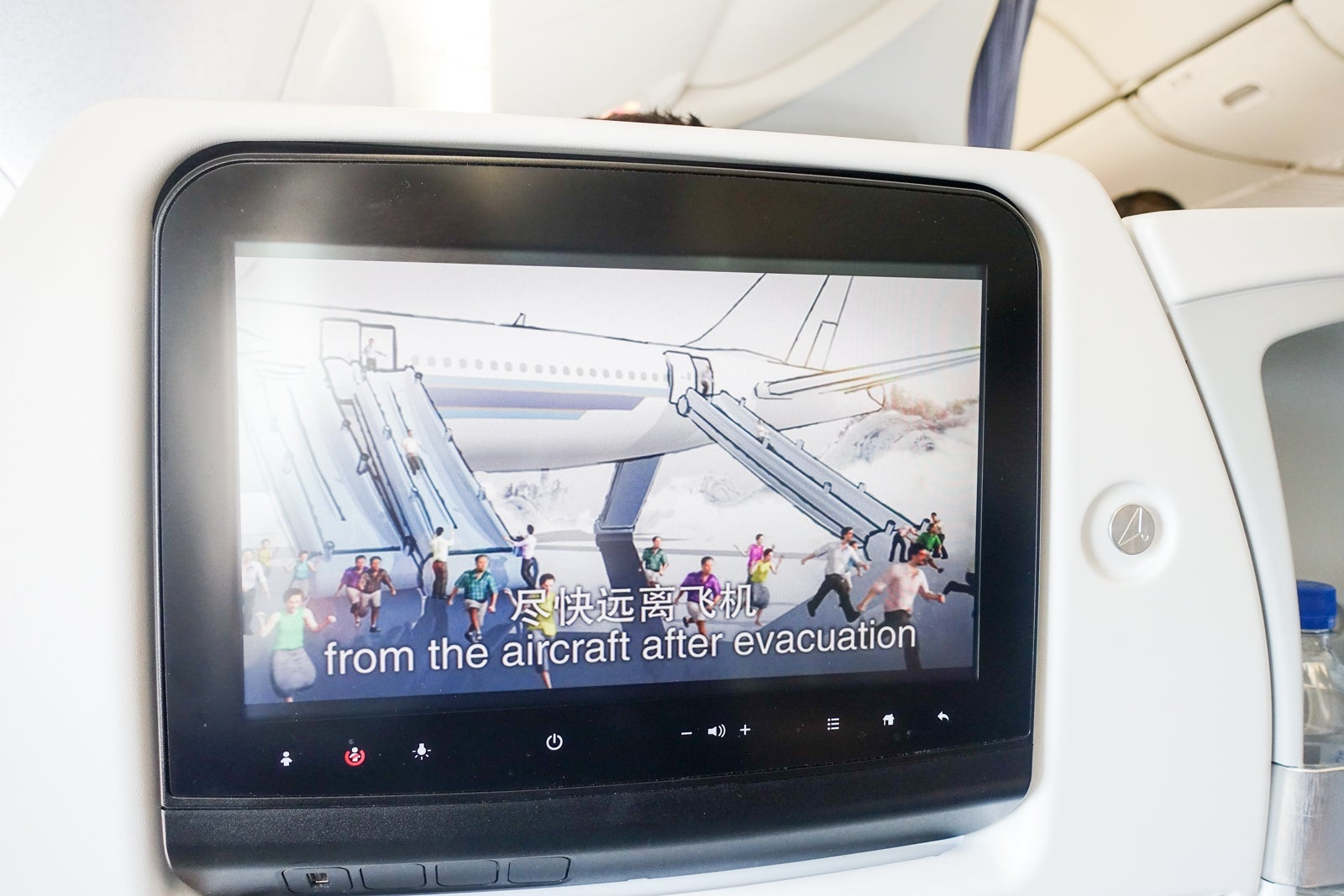 At 10:27am, I heard the cargo door close, and at 10:30am, the first welcome announcement had me thinking we were about to leave, on time. The purser then introduced the captain by name over the PA, and the safety video played — a rather calming affair featuring snowy mountains and serene views.
