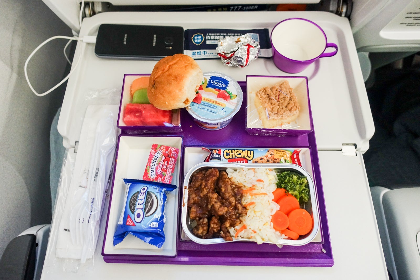 Half past midnight New York time, two hours from Guangzhou — where it was about 2pm on the day after our departure — out came the carts again for the third and final meal service. The choice was fried rice or a turkey sandwich. Neither seemed very appetizing, but I was hungry. The turkey was cold and came in a plastic wrap, period. No tray, no napkin and no way around the absolute fail of this flight's food offerings.