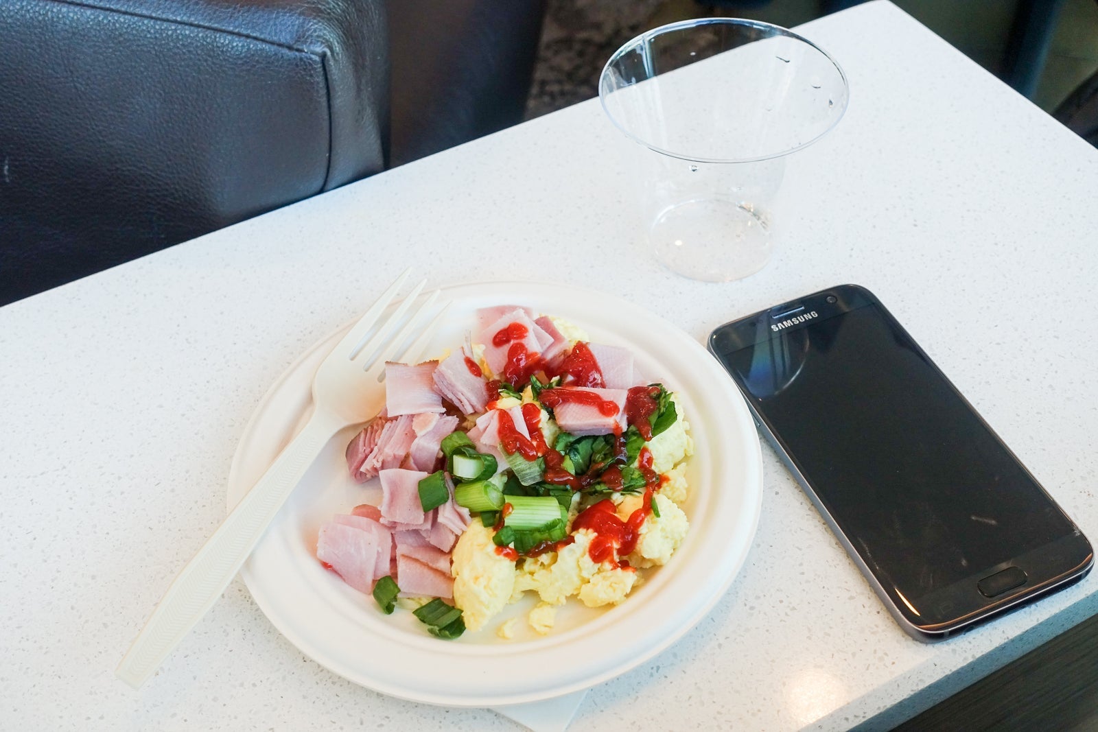 A quick bite of eggs and ham with sriracha and scallions was the best meal I would have until hitting the China Southern lounge in Guangzhou, 18 hours later.