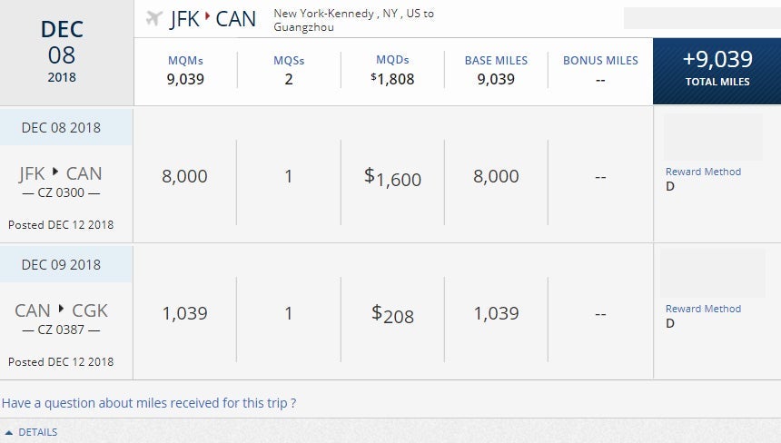 Just three days after landing in Jakarta, the miles and those all-important Medallion Qualifying Dollars showed up in my Delta account, pushing me to Platinum level for 2019. As of this writing, China Southern was a Group 3 partner for Delta, and as detailed in Delta's earnings tables for partner airlines, flying China Southern premium economy class earns 100% of miles flown in redeemable SkyMiles, plus 100% of those miles as Medallion Qualification Miles. Delta elite qualification is also determined by Medallion Qualification Dollars spent; in all fare classes, flying China Southern earns 20% of the distance flown as MQDs. That was a sweet deal: For $700 in spending, I got $1,808 in MQDs, more than enough to maintain my Platinum status.