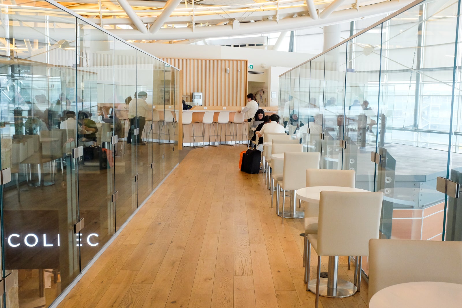 The lounge itself sits on a mezzanine above the primary terminal floor. It was bright and spacious, although a bit oddly shaped. There were plenty of available seating areas, even with a slew of overseas departures to Europe and Asia within the next few hours.