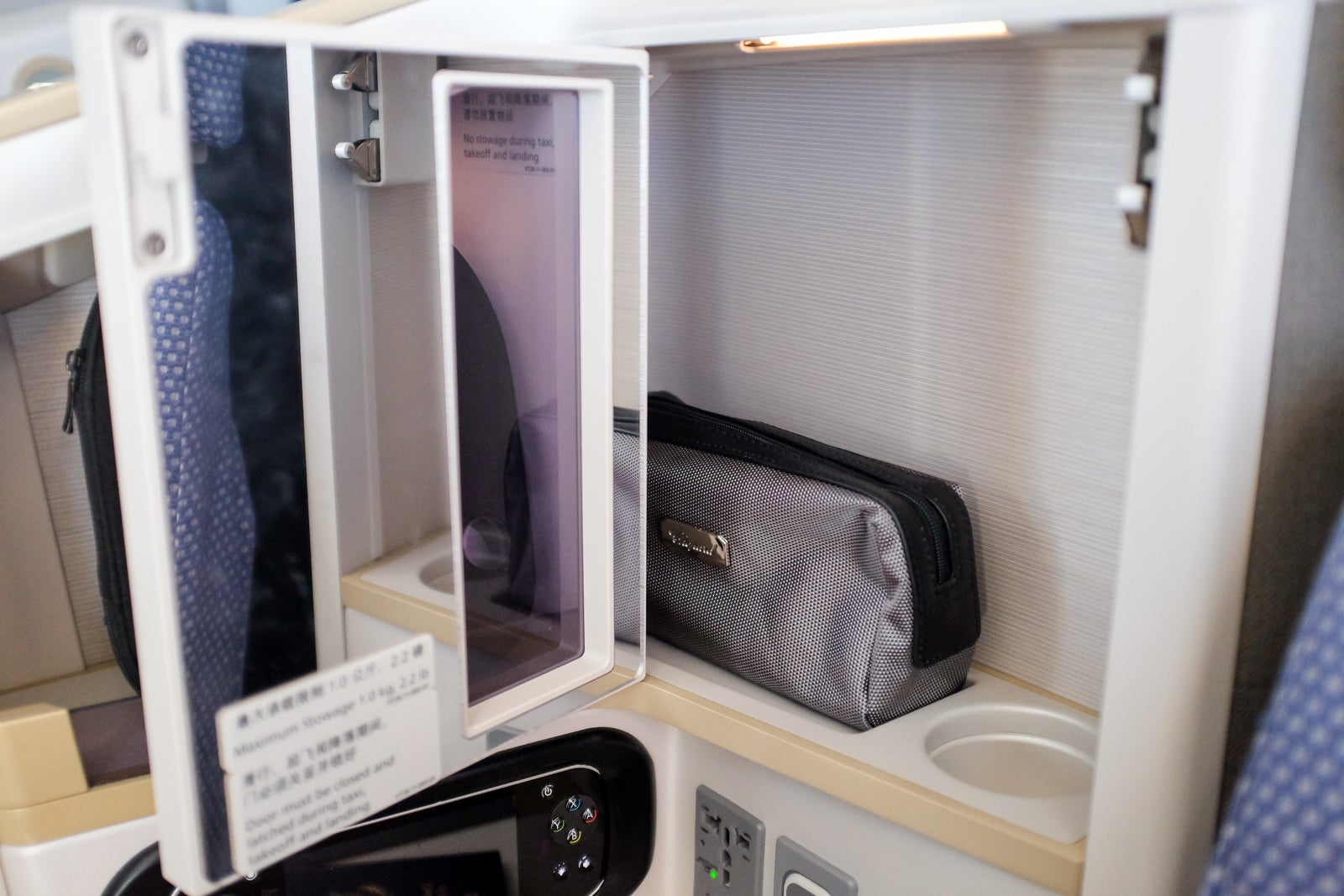 You could also find the primary seat controls, which offered an excellent degree of customization. The divider also housed the inflight-entertainment remote control, a standard 110V universal power outlet and the three-prong headphone jack.