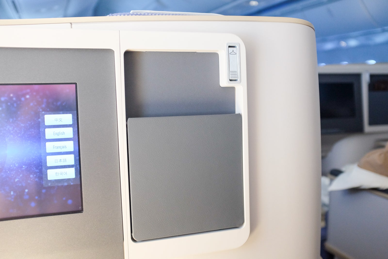 Each seat-back boasted a 15-inch IFE touchscreen, a multipurpose literature pocket and a metal coat hook.