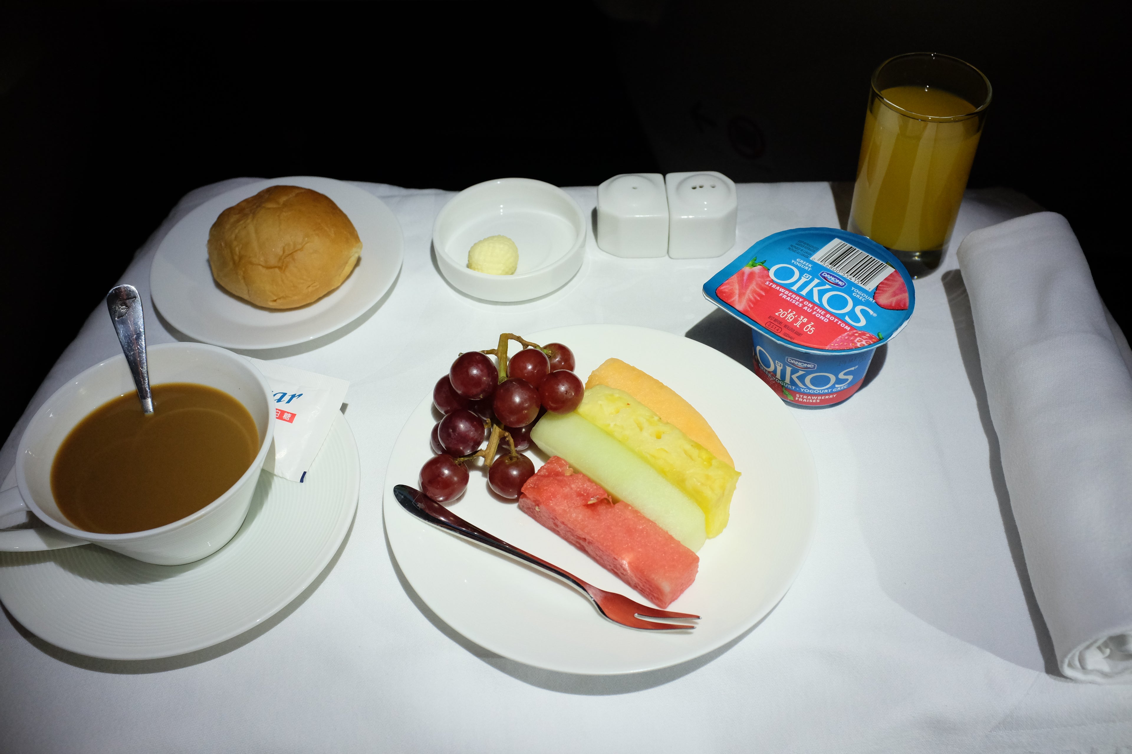 About 10 hours after takeoff from Vancouver and just under two hours until touchdown, the flight attendant came by to wake me up for the prearrival meal. On daytime westbound flights to Asia, the prearrival meal is usually served as breakfast even though most flights touch down in the late afternoon or evening. As such, the meal started with a light breakfast spread including fruit plate, Greek yogurt, warm bread, coffee and juice -- regardless of which entree you chose.