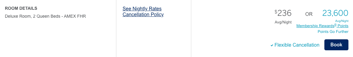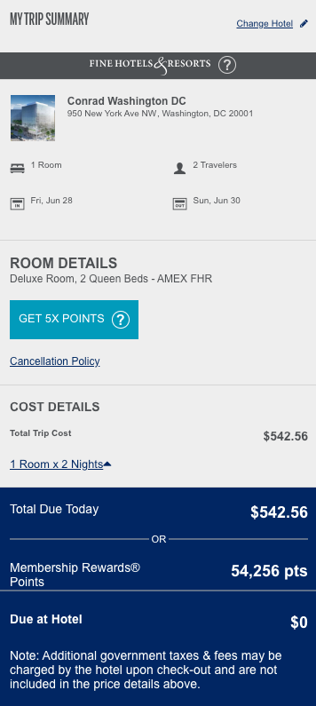 With taxes, the total cost was $542.56 for two nights. I decided to prepay for the hotel, since you can now earn 5x the points with FHR bookings by prepaying. The room was still fully refundable, making that an easy decision.