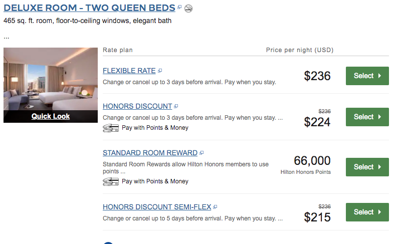 Luckily, the weekend I wanted at the end of June was relatively cheap. I found a Hilton Honors rate of $224 a night for a room with two queen beds on the Conrad's website. The same room would have been 66,000 Hilton Honors points a night. Given TPG's current valuations, those points are worth $396. Clearly, this was a stay where it made sense to pay cash.