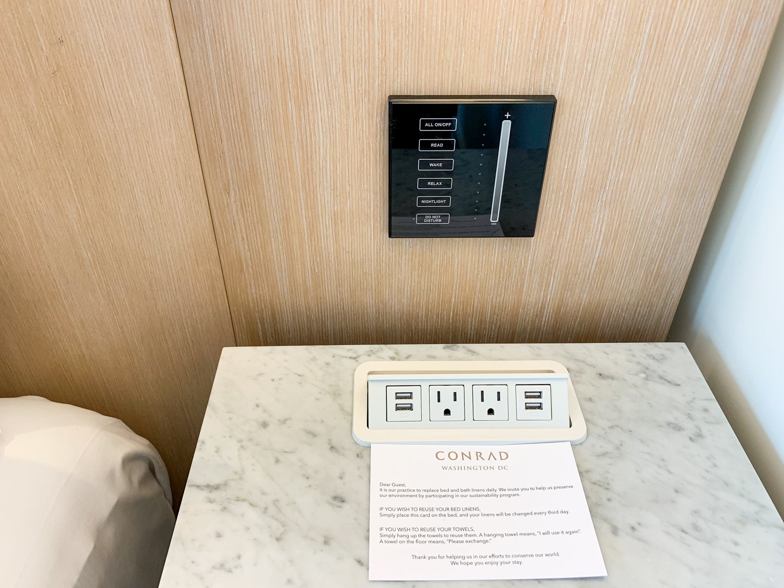 A bank of power outlets and USB ports was on each nightstand. Above that was a fancy control panel that controlled all the lights and the "Do Not Disturb" indicator.