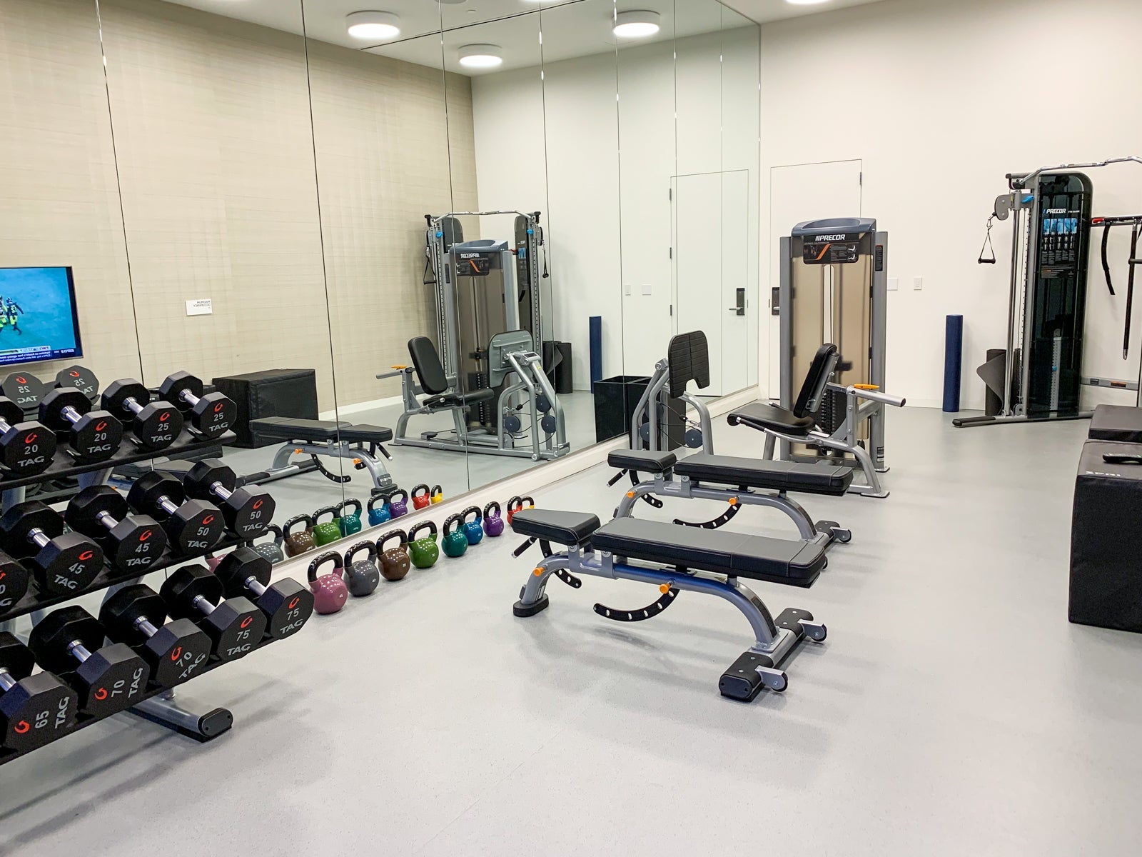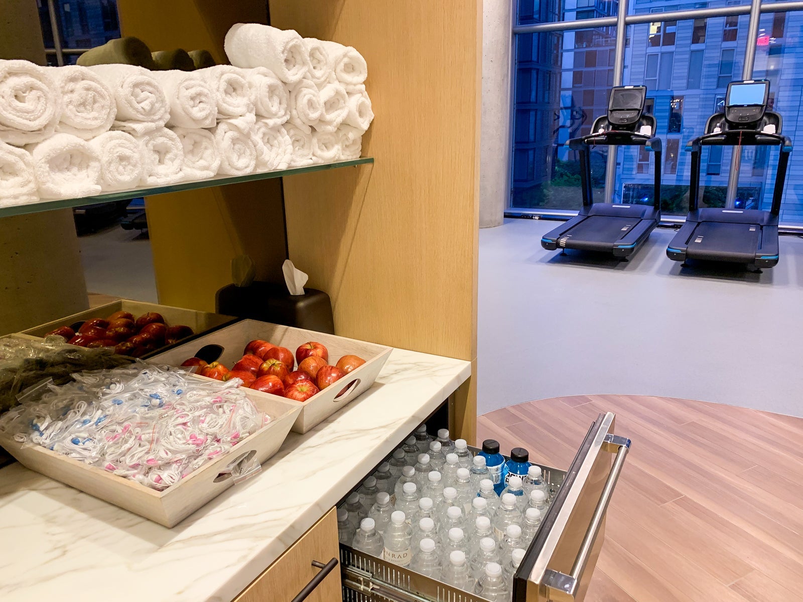 The fitness center was stocked with plenty of towels, apples, water and even a few bottles of Powerade. There were plenty of machines for cardio and an average area for weights.