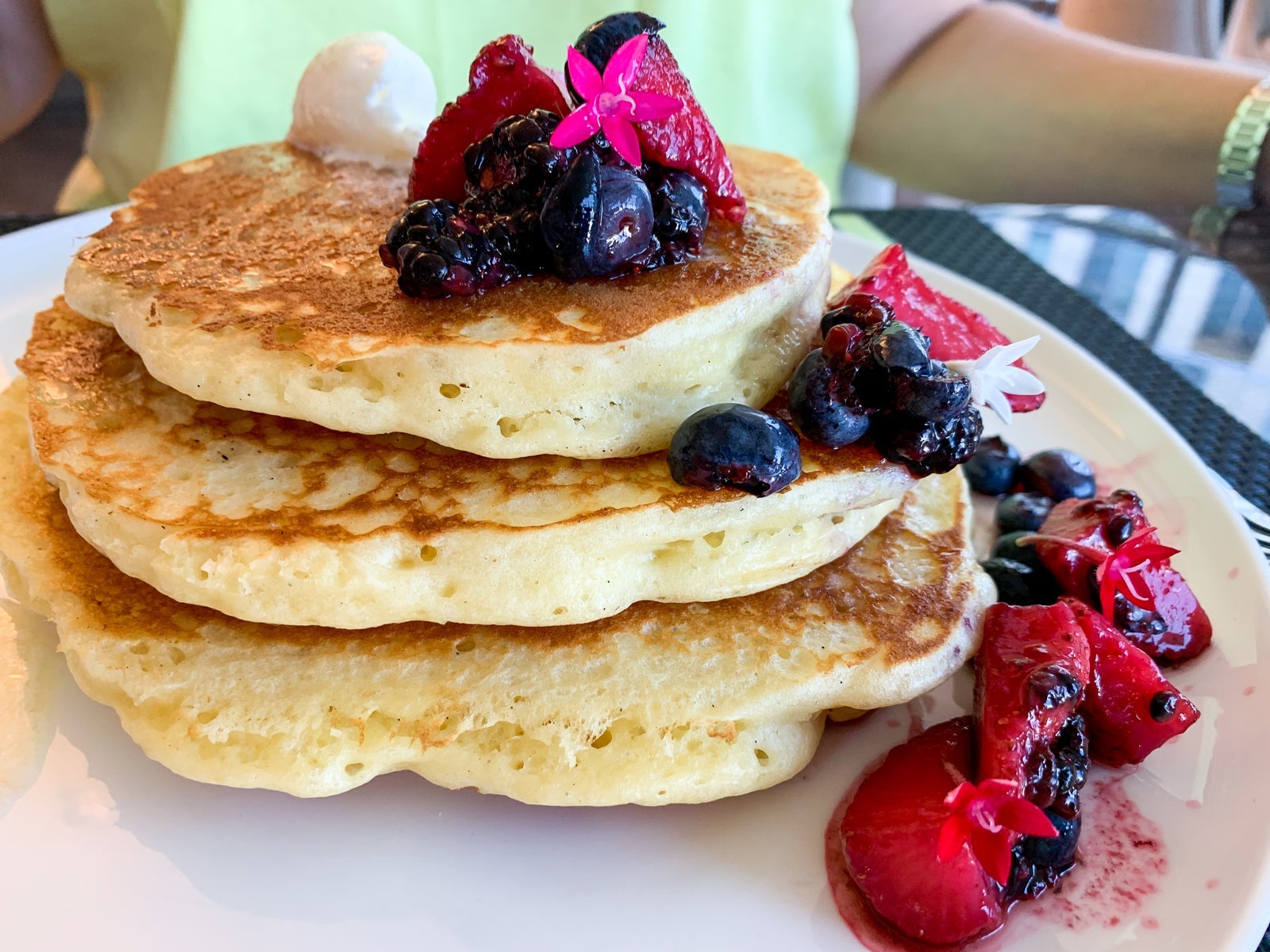 The children's chocolate chip pancakes were a hit -- how could they fail? -- but were not cheap at $12 off the kids menu. The buttermilk pancakes did the trick for my wife. With two orange juices, tax and tip, we spent $80 on breakfast. Luckily, $60 was covered and the rest chipped away at our $100 food-and-beverage credit.