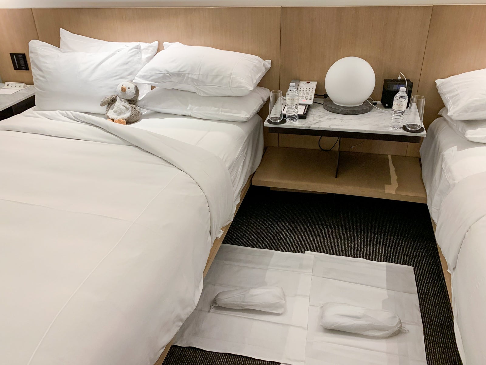 Housekeeping brought fresh ice with turndown service, something my daughter was giddy about. (And she will now wonder why every hotel doesn't offer that ice service.) We also got fresh water bottles on our nightstands and slippers next to the beds.