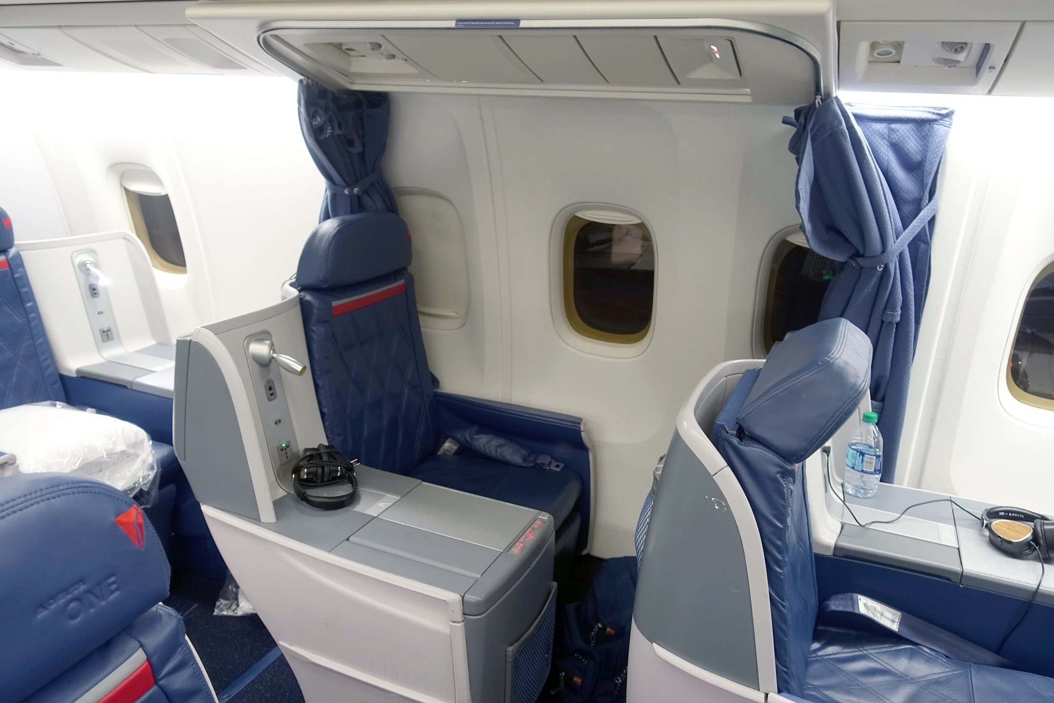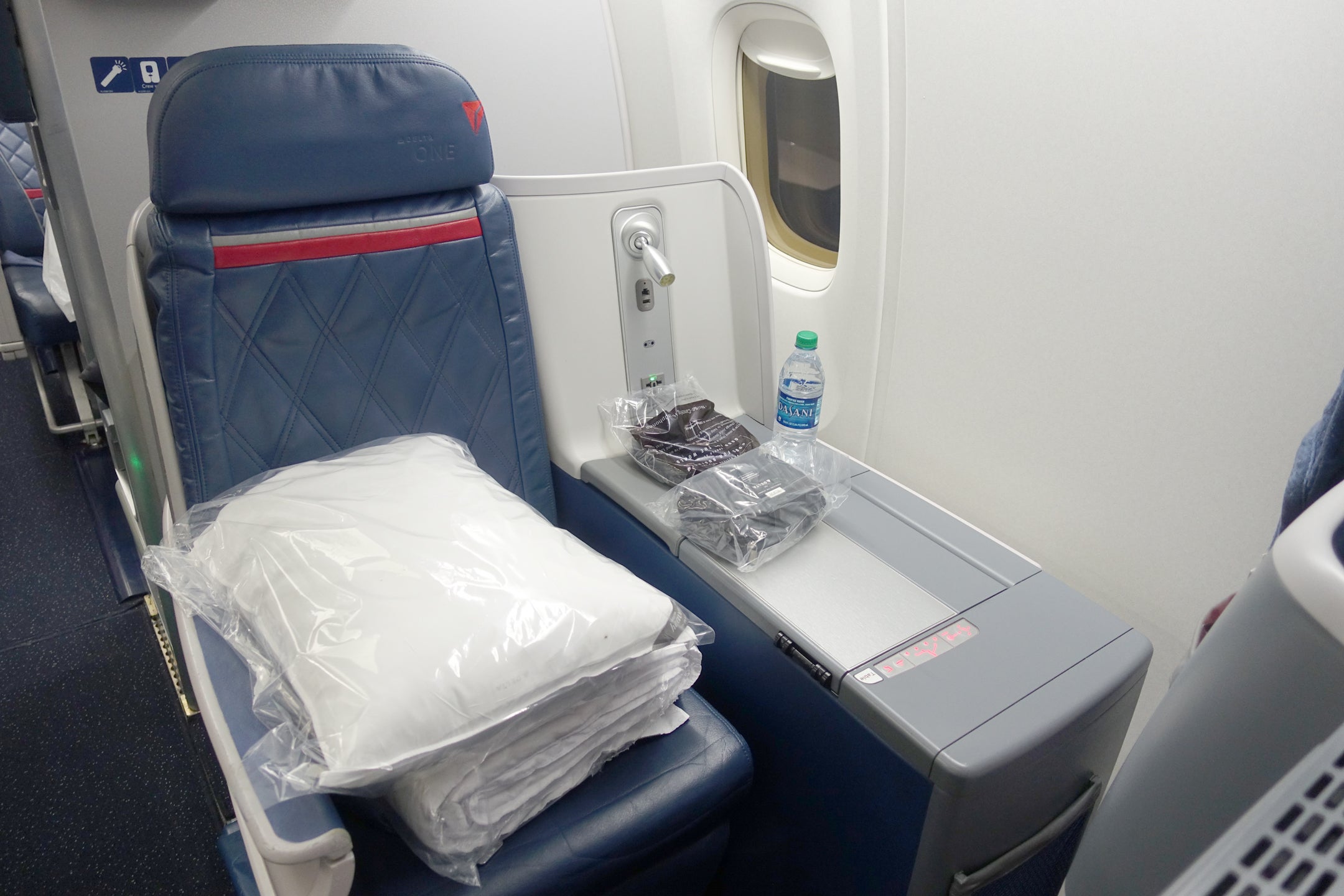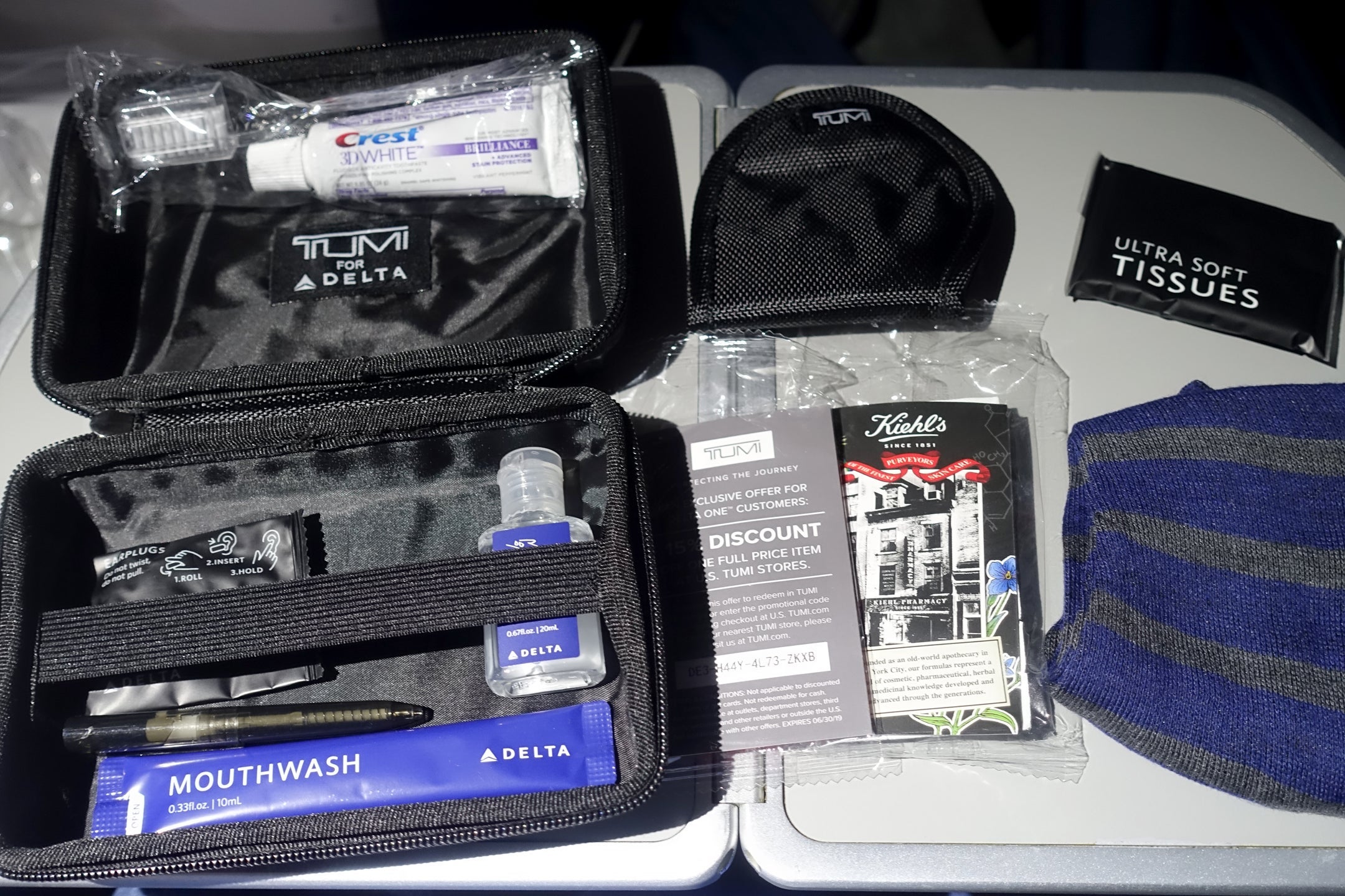 Waiting at each seat as passengers boarded were a pillow and blanket, a Delta Tumi amenity kit, headphones and a bottle of water.