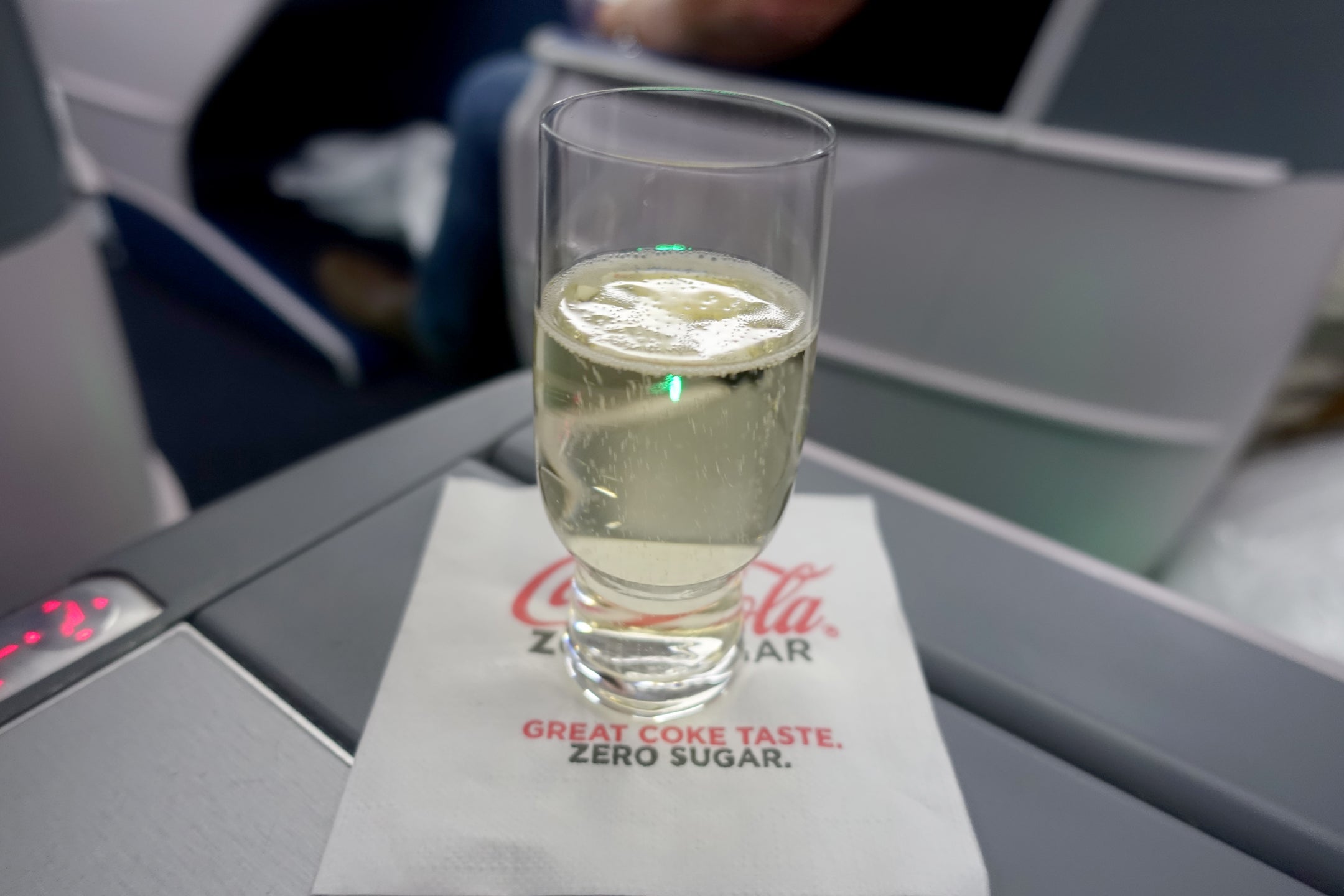 While we were boarding, the flight attendants came through the aisles offering a choice of orange juice or sparkling wine for a pre-departure beverage. I chose the wine, which was served in glassware and certainly nice to have before we took off.