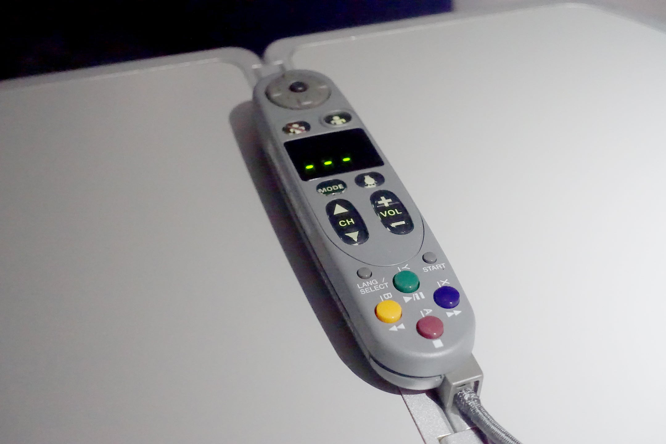 The IFE can be controlled either by touching the screen or via the one-sided remote. I found that the touchscreen wasn't terribly responsive — it regularly had mistargeted touches and a lot of lag. It was better with the remote, but still not terrific.