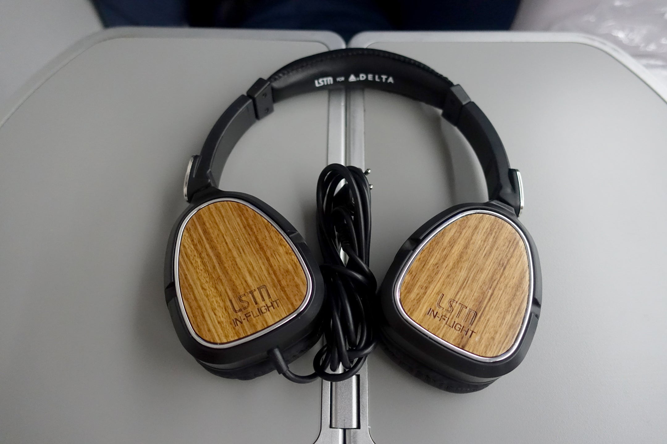 The provided headphones were unimpressive, with no real noise cancelling features and less than optimum sound quality. Nowhere near as good as the Bose headphones offered by American on its A321T transcon in business, though at least Delta didn't try to collect these a half hour before landing.