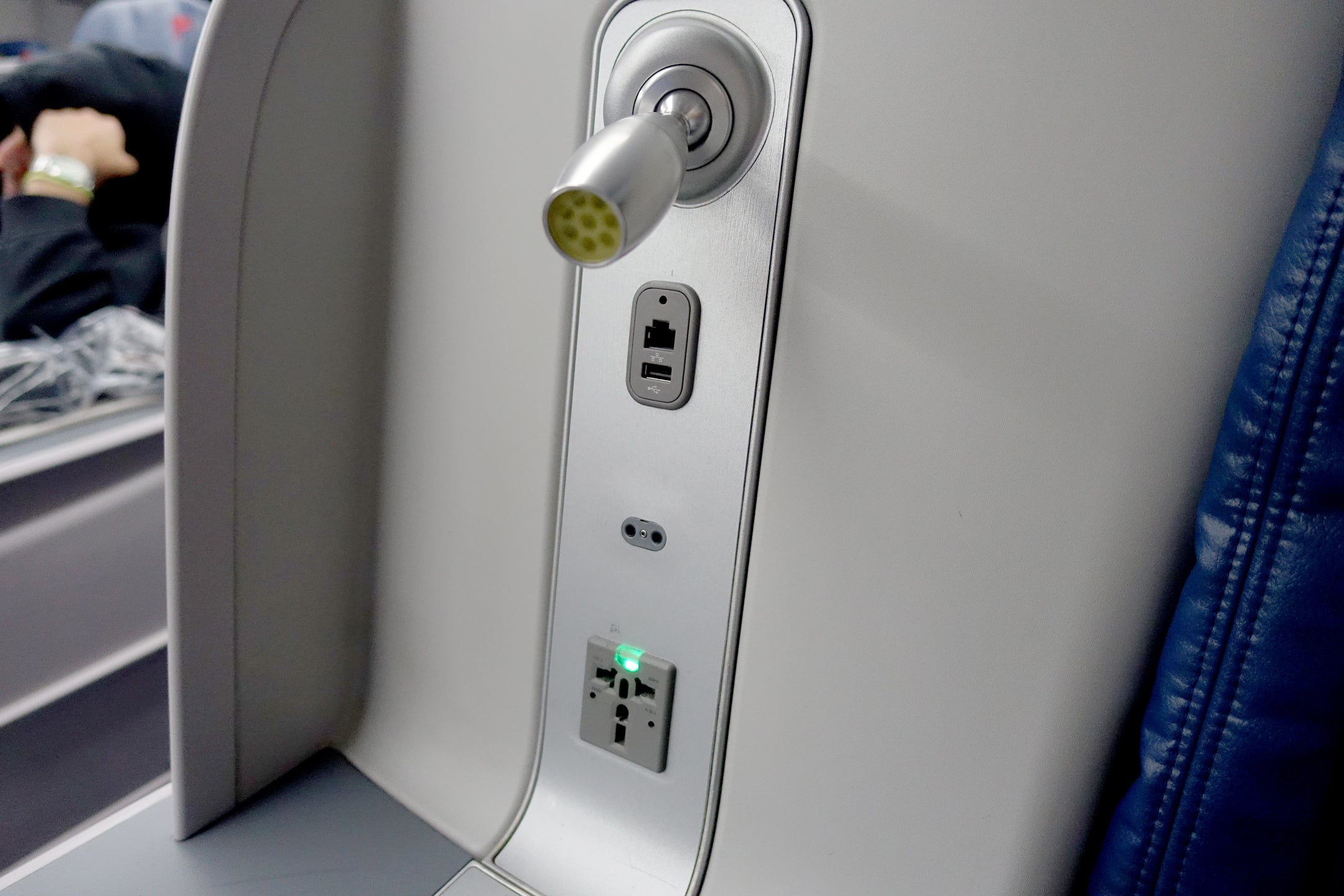 On the left or right of each seat, depending on the row, are the controls for most of the functions of the seat. At the front are the seat configuration controls themselves, which are standard and simple, allowing you to put the seat into a lie-flat mode. Also available are a standard A/C outlet, a USB port, a two-prong headphone jack and a reading light.