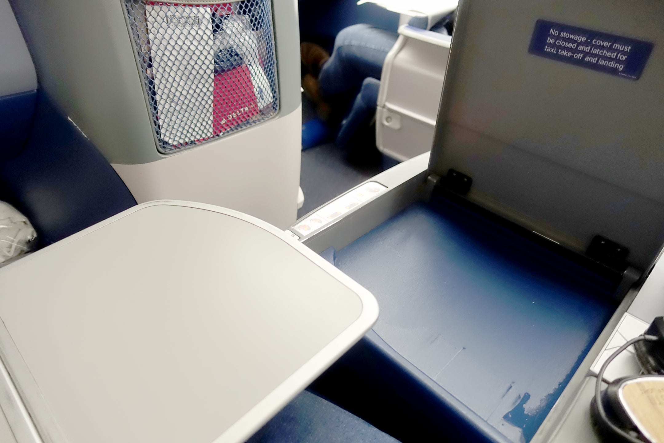 In fact, the seat itself has practically no places for storage at all except for the footwell underneath the seat in front of you, and that area has a sloped floor, which means almost anything you put in it will slide down. This is similar to the tray table, which is big enough for both a laptop and a drink, but which lists downwards to the side, enough for light items to slide and enough to be annoying with heavier items.