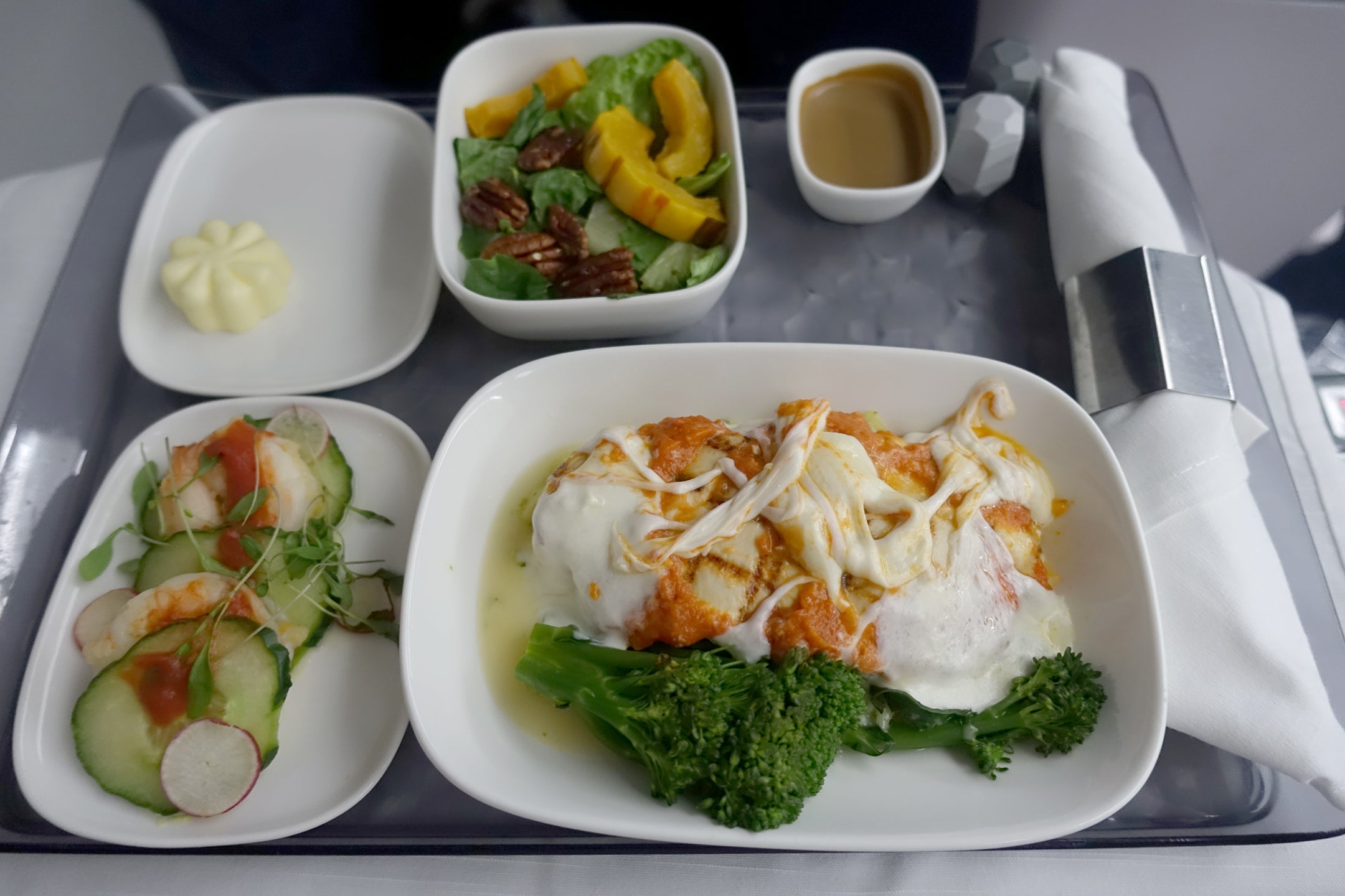 The flight attendant confirmed (correctly) that I had pre-ordered the chicken parmesan and asked for my beverage request. As I always do, I ordered a gin and tonic as a test drink, which was served with some mixed nuts (and a Coke that I also requested).