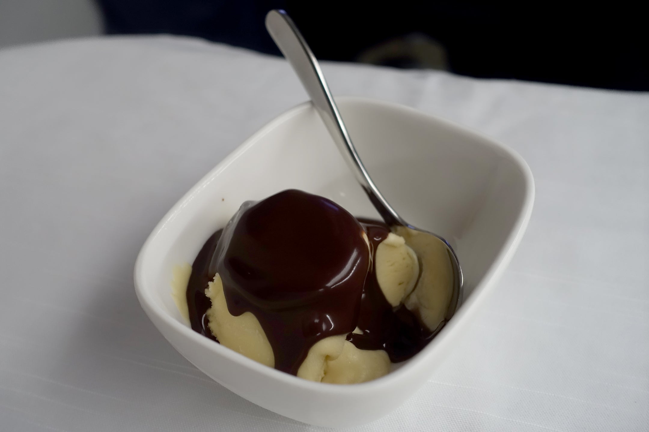 After dinner was cleared, I was offered the choice of a cheese and fruit plate or ice cream which the flight attendant referred to as a "sundae" and most certainly shouldn't have (the menu itself more accurately describes it as "vanilla maple ice cream topped with spiced chocolate sauce"). Compared to the full blast sundae offered on United's transcon, the Delta version comes off as rather pathetic.