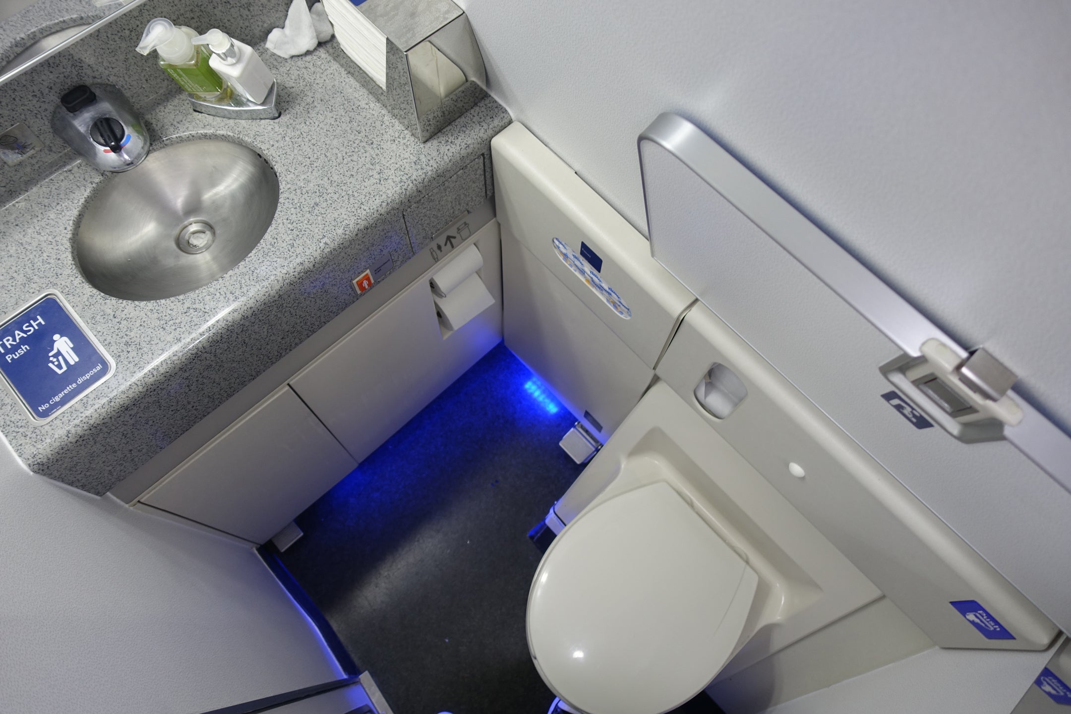 The two bathrooms were small and not terribly clean. When I used it halfway through the flight, there was a leftover cloth towel sitting on the sink and a bit of paper towel clogging the sink drain.