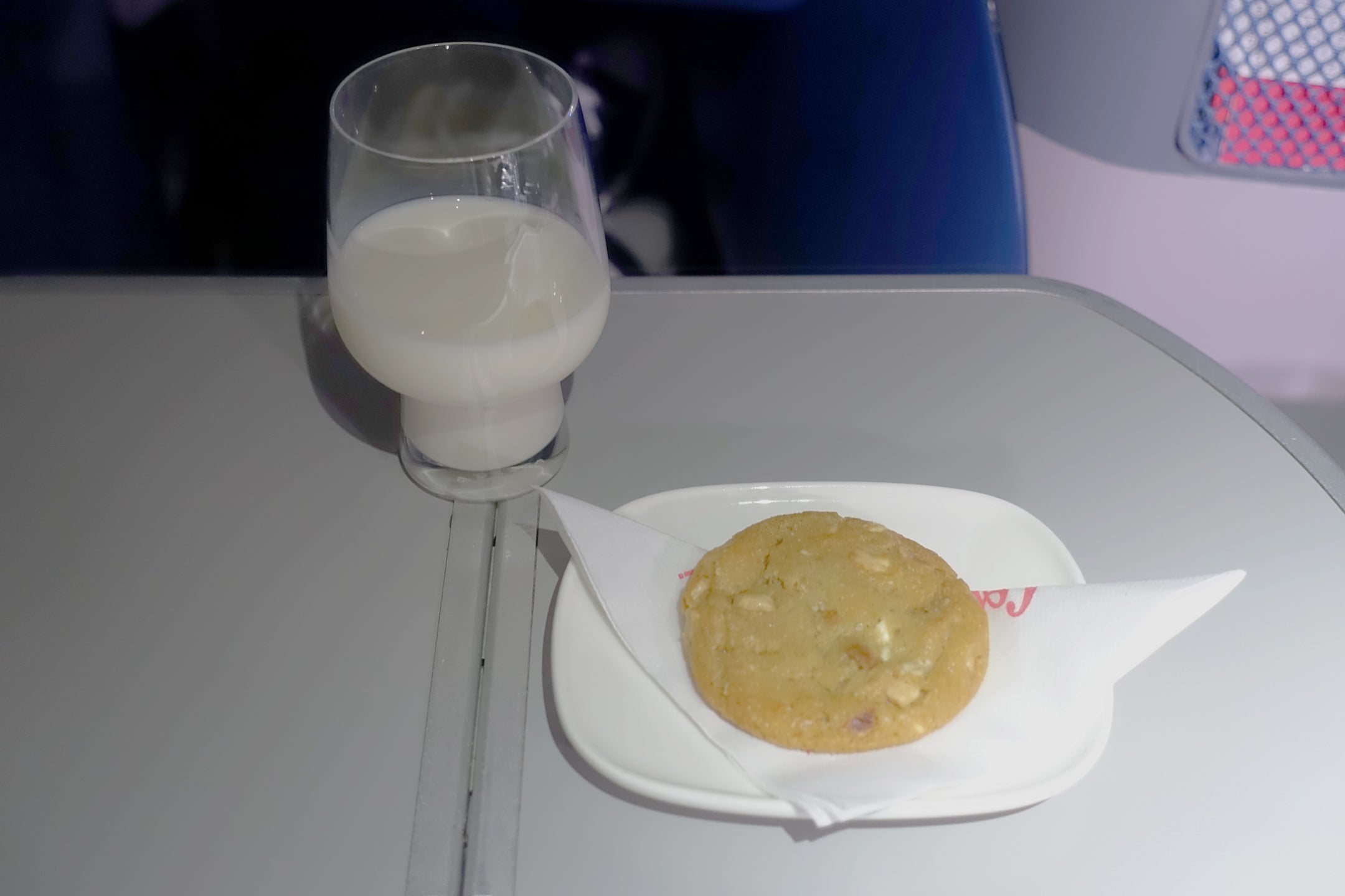About two-thirds of the way through the flight, the flight attendant came by with a warm cookie and glasses of milk, which literally might have been the most palatable food and beverage item handed to me during the entire flight.