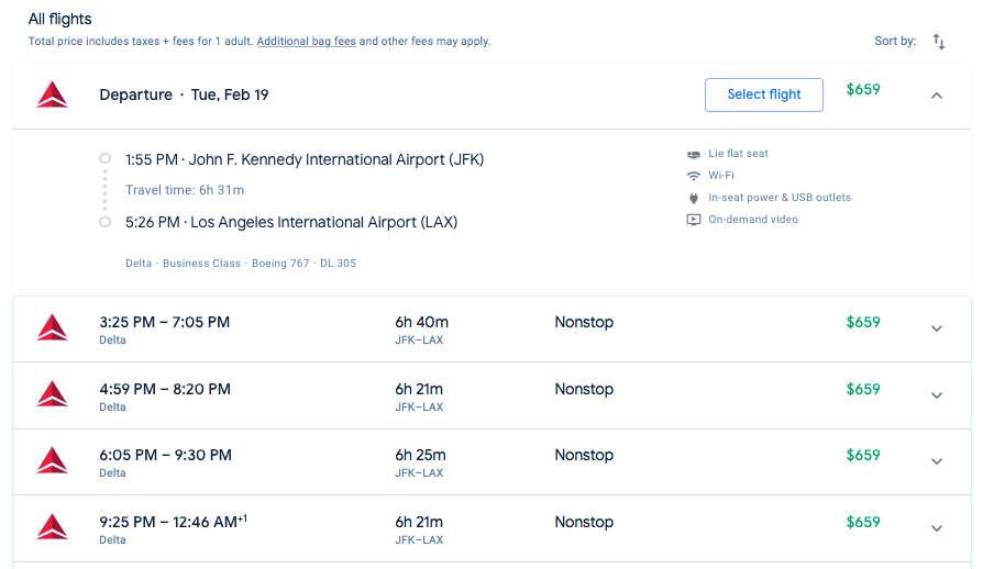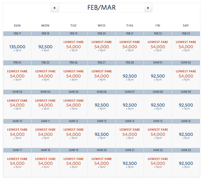 But when it comes to premium cabins, it's a somewhat different story. There's no set award chart for the SkyMiles program, so the only way to price an award is to search for it online at delta.com, and an extensive search of the calendar shows that the lowest price you'll currently find is 54,000 SkyMiles for a one-way transcontinental flight in Delta One business class.