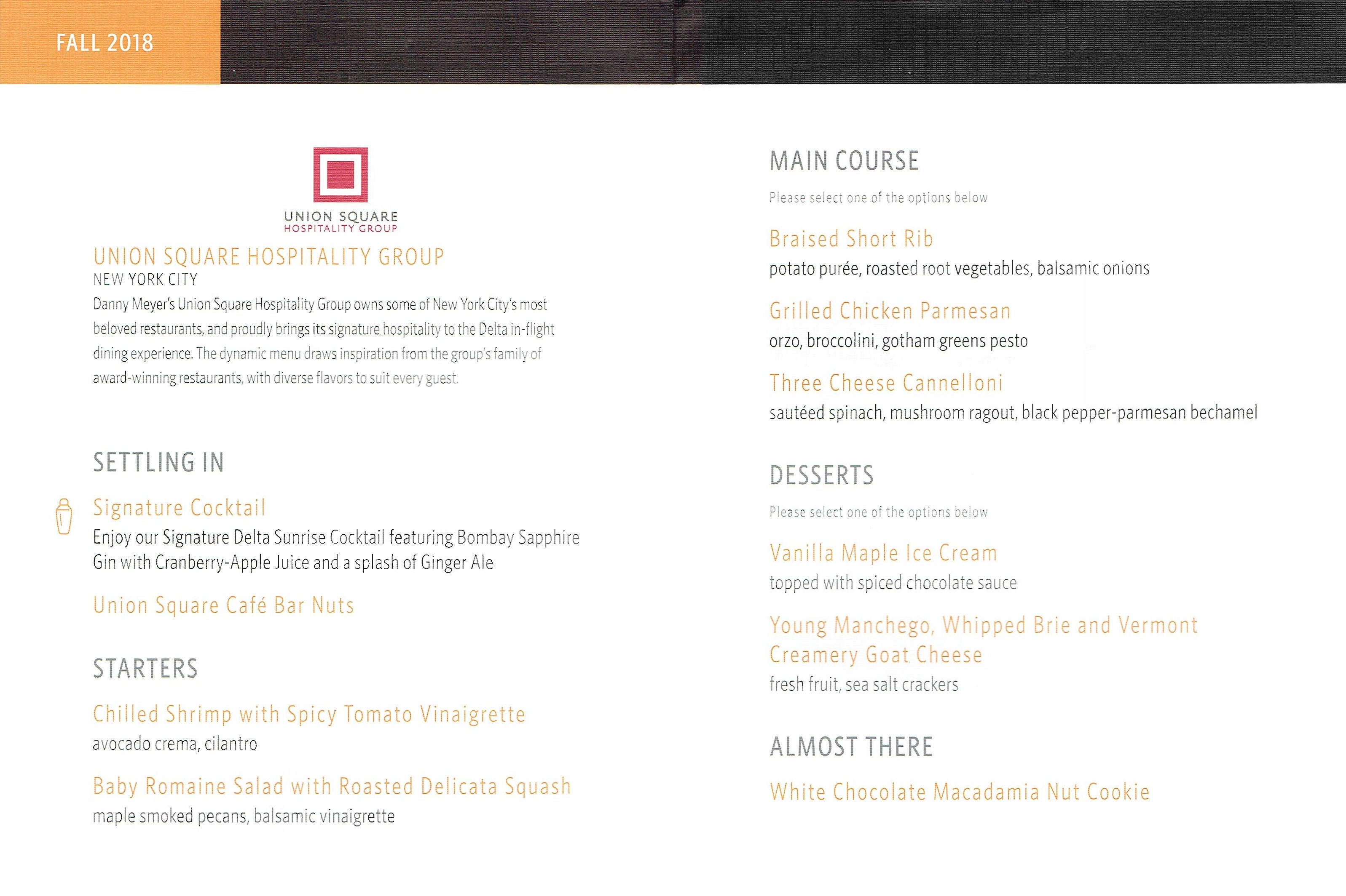 About 15 minutes after we were airborne, the flight attendant came by to take our dinner orders. The menu offered three options for a main course, but I had already taken advantage of the option to select my meal a few days ahead of time by email. This is a technology that's expanded in recent months to more Delta flights and is much appreciated, though I somewhat prefer AA's version that allows you to choose your meal on its website versus having to wait for an email from Delta.