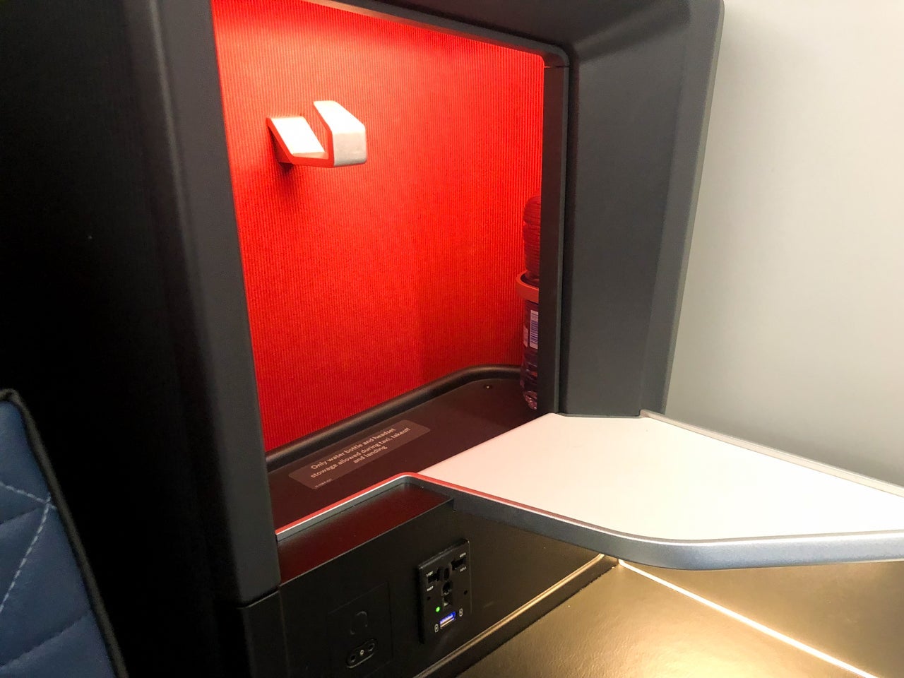 But for a 1-year-old aircraft delivered to Delta from Airbus in December 2017, I was expecting the functionality of the seat customization to be a little more intact. Plus, one corner of the suite closest to the small storage compartment showed obvious wear and tear — likely the result of passengers attempting to put items too large in the small space.