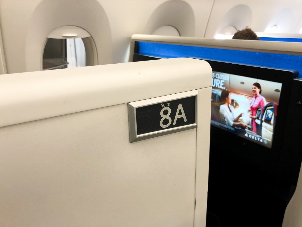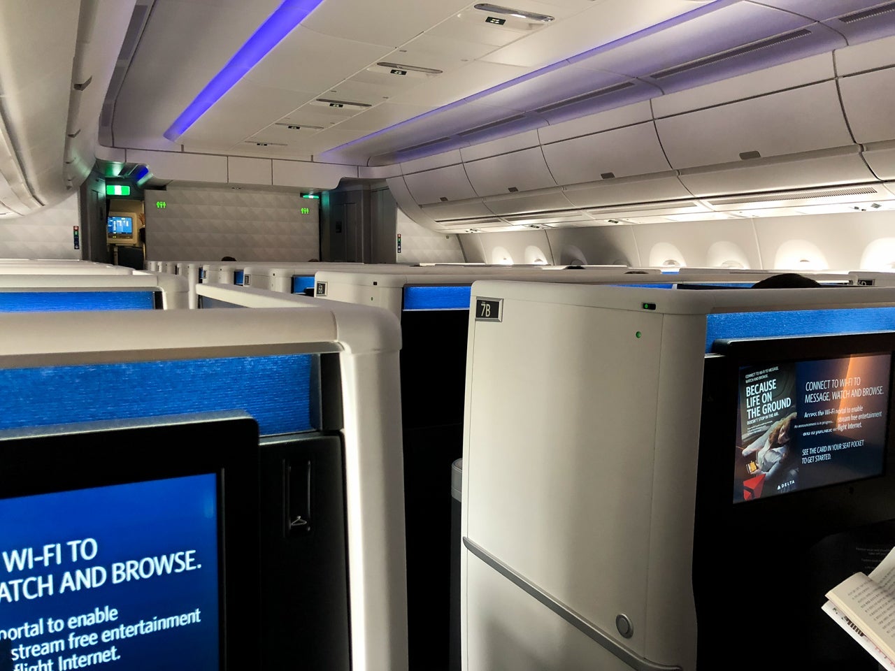 Delta's A350 cabin was best described as fresh. The cabin as a whole was bright, with crisp finishings. Each of the suite doors was white with a bright blue-and-black stitched seat. My seat, 8A, was a window seat at the very rear of the cabin.