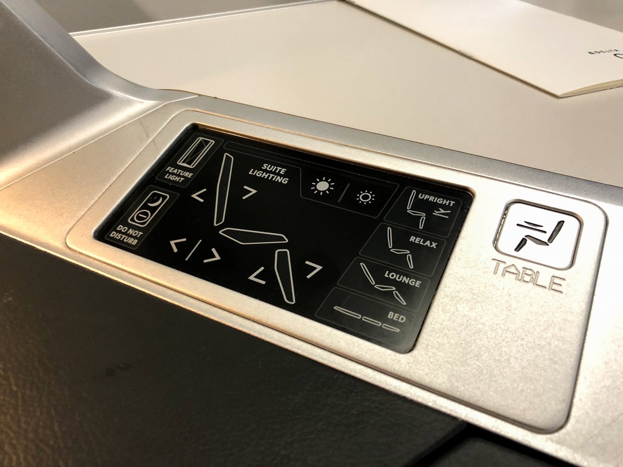 A single, simple console on the side table controlled the seat's lie-flat, upright and lounging positions, the do-not-disturb function and its lighting. Selecting each of the options required a bit of force, but nothing completely out of the ordinary.